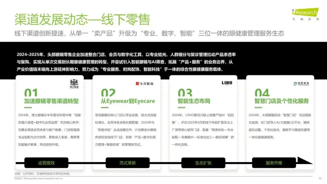渠道方面,线下从卖产品向视力健康管理升级,线上成为增量战场,智能眼镜品类增长显著。同时行业仍面临价格不透明、验配不专业等痛点,未来技术将向精准化、智能化演进,光学镜片与智能眼镜的跨界融合也将成为重要趋势。