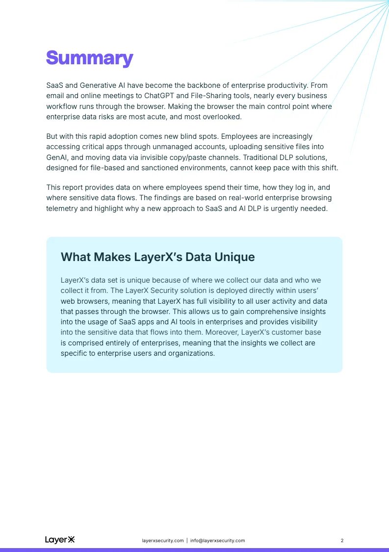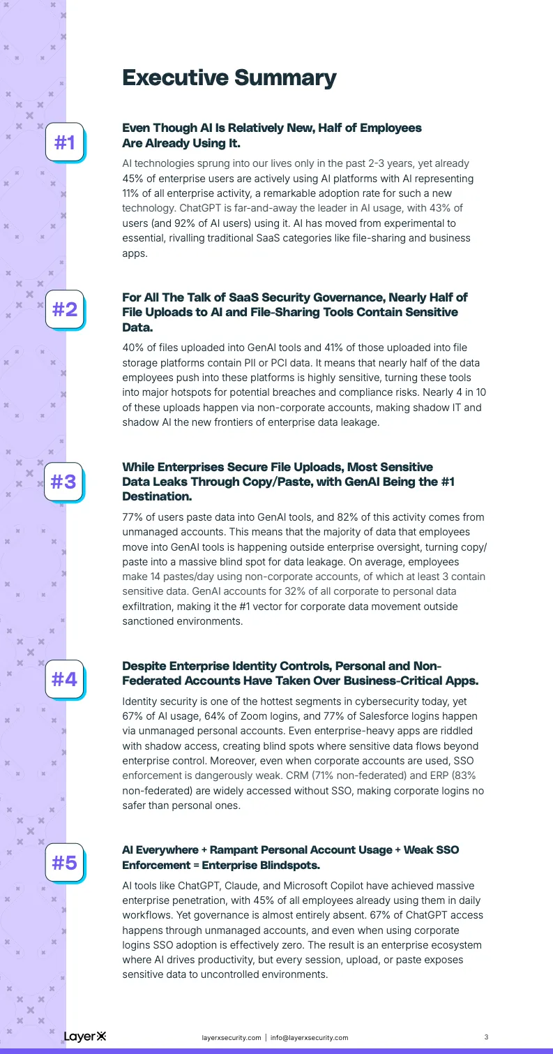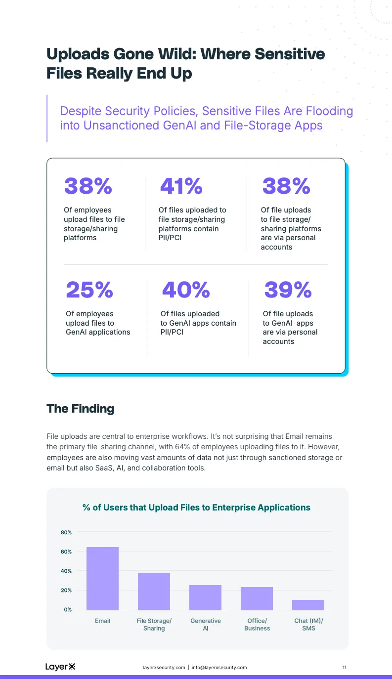 高速普及的另一面,是敏感数据暴露风险的同步放大。报告指出,40%的文件上传至生成式AI工具的内容包含PII或PCI数据,文件存储平台中的这一比例为41%。换言之,几乎每两次上传,就有一次涉及高度敏感信息。这些上传行为中,约四成发生在非企业账号之下,使得大量关键数据在未经审计和留痕的情况下进入外部平台,合规与泄露风险被系统性放大。