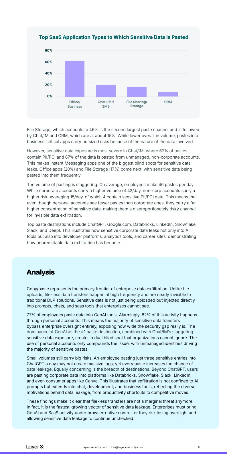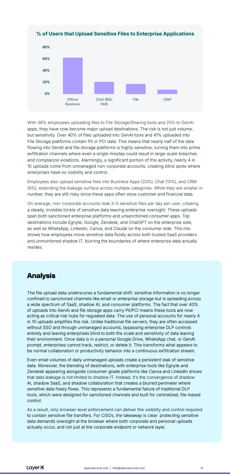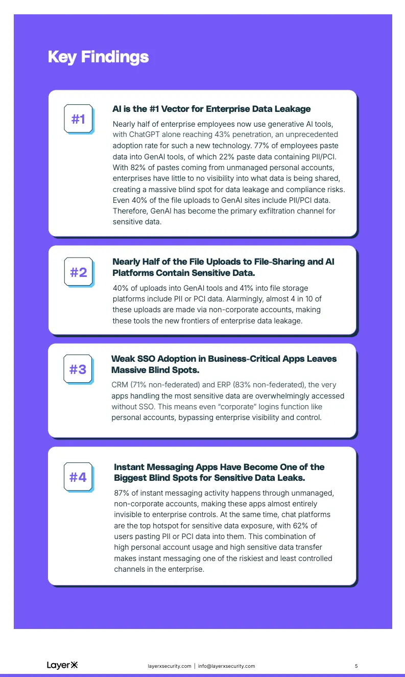 即时通信工具构成了另一处高风险盲区。87%的聊天应用使用发生在非企业账号环境下,而62%的企业用户曾在聊天中粘贴包含PII或PCI的数据。相较于文件上传,这类行为频次更高、痕迹更少,使得敏感信息以“碎片化、持续性”的方式流出企业边界,显著提升了长期合规和内部威胁风险。