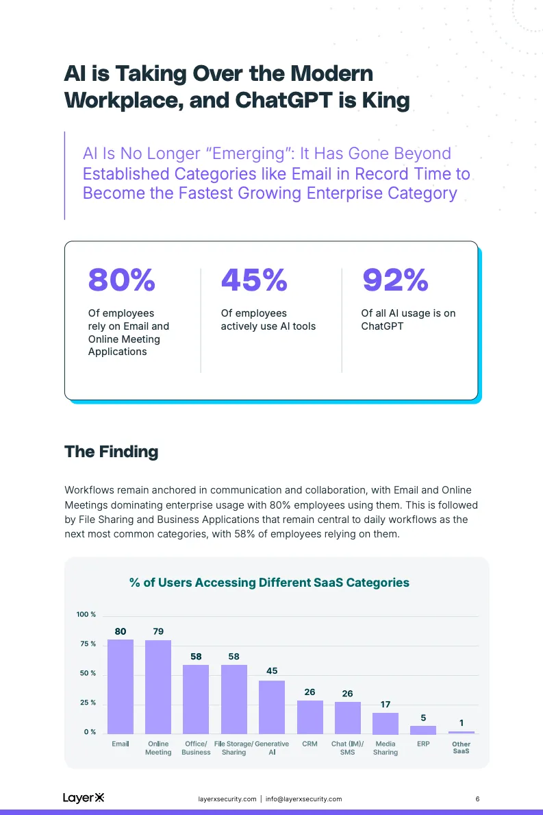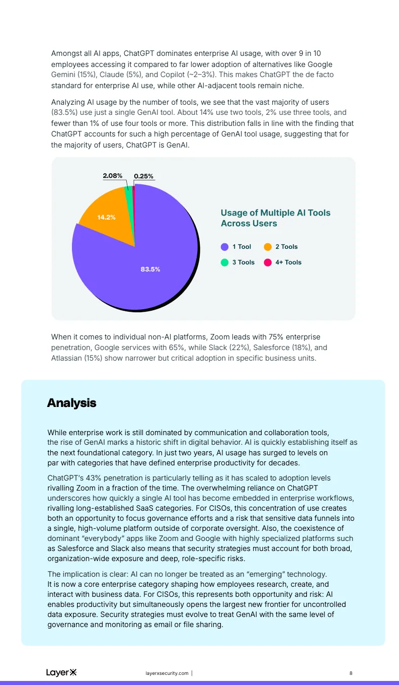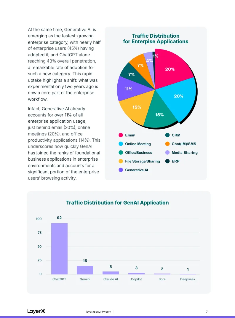 生成式AI正在以前所未有的速度嵌入企业核心工作流。报告数据显示,尽管AI真正进入企业环境仅有两到三年时间,但已有45%的企业员工在日常工作中使用生成式AI工具,其相关流量已占全部企业应用访问的11%。在所有AI工具中,ChatGPT几乎形成垄断,占据92%的AI使用量,整体渗透率达到43%,其扩散速度已可与电子邮件、在线会议等传统基础型SaaS应用相提并论,标志着AI已从“新技术”跃迁为“基础设施”。