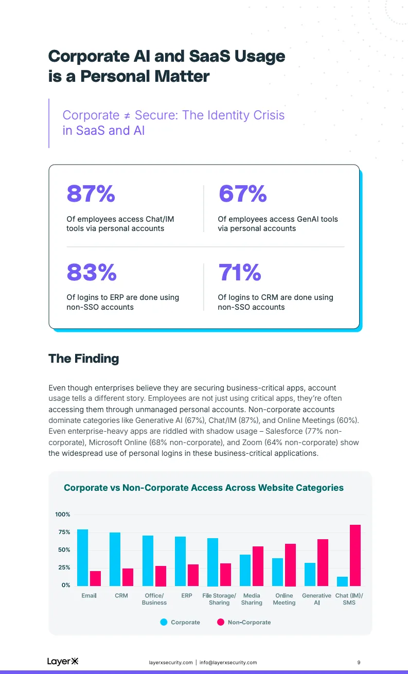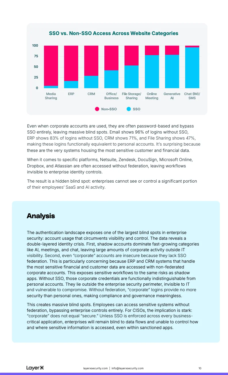 身份治理的失效进一步加剧了这一风险。数据显示,67%的生成式AI访问、64%的在线会议登录以及77%的CRM访问,均通过个人或非托管账号完成。即便使用企业账号,SSO的覆盖率仍然极低,ERP系统中83%的登录未启用SSO,CRM也高达71%。这意味着大量“企业系统”的访问行为,在安全强度上与个人账号并无本质差异,企业对核心业务数据的可视性和控制力被严重削弱。
