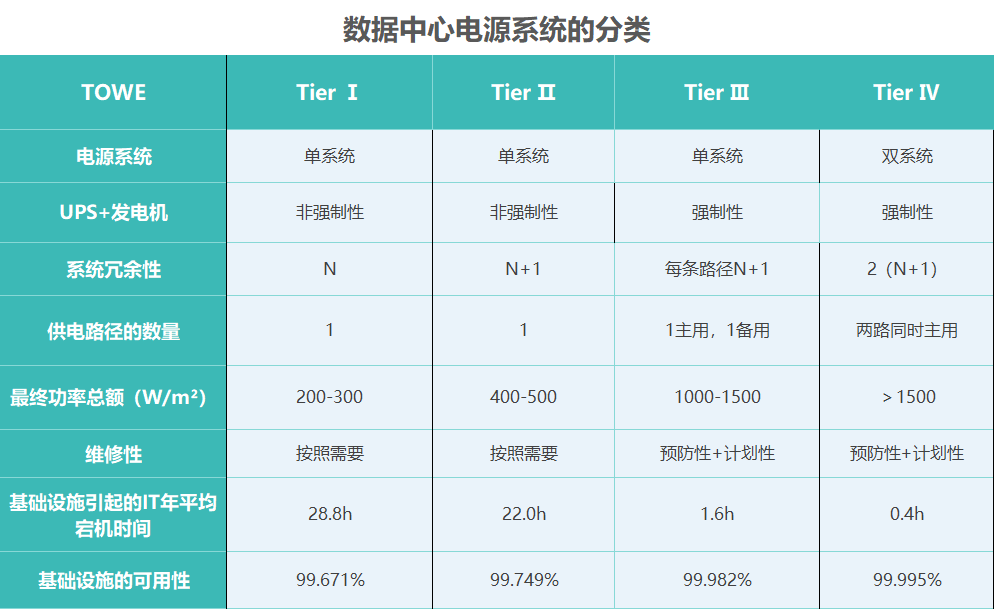 发电机组的主要作用是市电中断时立即启动为负载提供持续、稳定的电力供应。UptimeInstitute是一个国际公认的组织,它对如何设计数据中心设施进行了规定和认证。它根据数据中心的可用性分为四个等级:TierⅠ(基本型)、TierⅡ(部分冗余型)、Tier Ⅲ(可同时维护型)和Tier Ⅳ(故障容错型)。数据中心所拥有的提供持续电源和应急电源的设备数量是决定它们属于哪一等级的重要因素。具体分类如下图所示。数据中心机房是网络枢纽和IT运行管理中心,担负着企业日常管理、运营、监控企业信息系统运行状况,更是信息中心的重要基础,因此机房建设工作必须严谨规范。