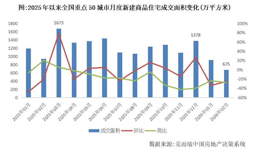 克而瑞监测数据显示,2026年2月,全国重点50城市新建商品住宅成交面积约675万平方米,环比下降26%,同比减少28%,累计成交面积1584万平方米,累计同比跌26%。