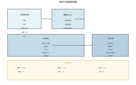 PCB产业链从上至下依次为:上游原材料、中游基材(覆铜板)、中游PCB制造、下游电子产品应用。产业链呈现上中游集中度高、下游分散的特点。
