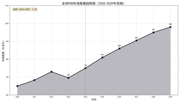 图2:全球PCB市场规模趋势图(2020-2029年预测)