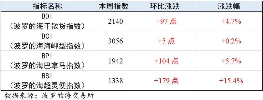 本周全球干散货船市场需求增加,波罗的海干散货运价有所上涨,周五报收于2140点,较上期上涨4.7%。