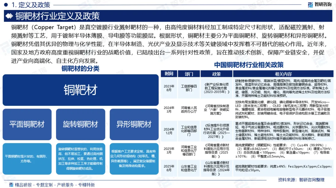 行业政策:铜靶材凭借其优异的物理与化学性能,在半导体制造、光伏产业及显示技术等关键领域中发挥着不可替代的核心作用。近年来,国家及地方政府高度重视铜靶材行业的战略价值,已陆续出台一系列针对性政策,旨在推动技术创新、保障产业链安全,并促进产业向高端化、自主化方向发展。例如,2024年12月,工业和信息化部等四部门印发《标准提升引领原材料工业优化升级行动方案(2025—2027年)》,重点开展超高纯金属及合金靶材/蒸发料、形状记忆合金、高端聚烯烃、电子气体分离膜材料、电池膜材料、光学膜材料、光伏用膜材料、生物基新材料、特种涂料、特种胶黏剂、新型催化剂、高端试剂、稀土储氢材料、稀土磁性材料、稀土光功能材料、反光釉料、新能源复合金属材料、新能源电池材料等关键战略材料标准制修订。2025年3月,河南省工业和信息化厅等四部门印发《河南省重点新材料首批次应用示范指导目录(2025版)》,高纯度铜靶材(铜靶胚料)性能要求:(1)Cu≥4N(99.99%);(2)密度≥8.942/cm²;(3)晶粒尺寸≤50um;(4)硬度≤70HV;(5)总杂质含量<100ppm;(6)氧含量≤10ppm;(7)电导率≥101%;(8)平整度≤0.5mm/m。