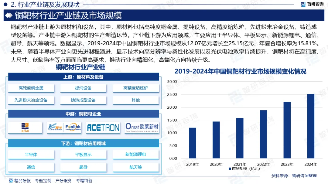 市场规模:溅射靶材根据材质可分为金属靶材、合金靶材和陶瓷化合物靶材,其中,金属靶材包括铜靶材、铝靶材、铬靶材、镍靶材、钛靶材、钽靶材等。铜靶材作为溅射镀膜工艺中的关键材料,在半导体制造、平板显示以及太阳能光伏等行业中具有广泛应用。铜靶材在薄膜制备技术中展现出重要的应用价值与发展潜力,通过对制备流程的优化、性能特点的精准控制以及生产环节的严格管理,能够制备出高品质的铜靶材,从而满足不同下游领域的差异化需求。随着半导体技术的持续进步与市场规模的稳步扩大,市场对高性能靶材的需求日益增强,铜靶材作为半导体制造中的核心材料之一,其市场需求保持稳定增长。数据显示,2019-2024年中国铜靶材行业市场规模从12.07亿元增长至25.15亿元,年复合增长率为15.81%。未来,随着半导体产业向更先进制程演进、显示技术向高分辨率与柔性化发展以及光伏电池效率持续提升,铜靶材将在高纯度、大尺寸、低缺陷率等方面面临更高要求,推动行业向精细化、高端化方向持续升级。