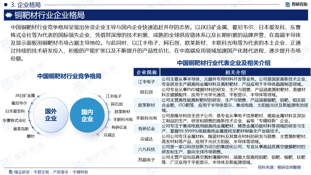 企业格局:中国铜靶材行业竞争格局呈现出外资企业主导与国内企业快速追赶并存的态势。以JX日矿金属、霍尼韦尔、日本爱发科、东曹株式会社等为代表的国际领先企业,凭借其深厚的技术积累、成熟的全球供应链体系以及长期积累的品牌声誉,在高端半导体及显示面板用铜靶材市场占据主导地位。与此同时,以江丰电子、阿石创、欧莱新材、丰联科光电等为代表的本土企业,正通过持续的技术研发投入、积极的产能扩张以及不断提升的产品性价比,在中高端应用领域加速国产化替代进程,逐步提升市场份额。整体市场虽仍由外资企业掌握话语权,但国内企业凭借政策支持与本土化服务优势,正逐步打破垄断,形成内外资企业竞合共生的多元竞争格局。