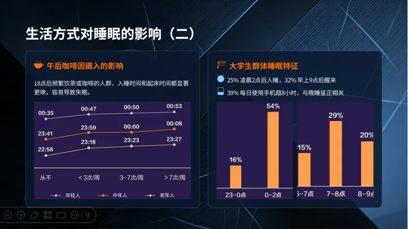 研究人群夜间平均睡眠时长仅6.85小时,虽较上一年度增加6分钟,但仍不足7小时,全人群平均入睡时间达00:18,零点后入睡人群已超半数