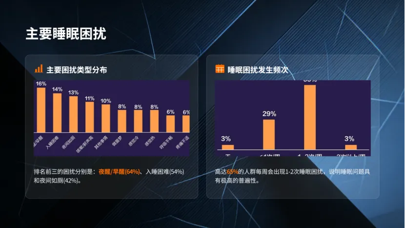 65%的人群每周会出现1-2次睡眠困扰,仅3%的人群完全无睡眠困扰,3%的人群每周出现3次以上高频睡眠困扰