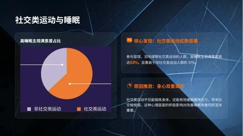 参与社交类运动的人群,睡眠主观满意度达63%,较非社交类运动人群高出26个百分点