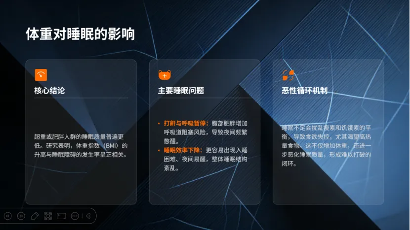 。报告明确,体重异常特别是超重和肥胖,是导致心脑血管疾病、糖尿病和部分癌症等慢性病的重要危险因素,同时也会对睡眠健康产生显著负面影响。