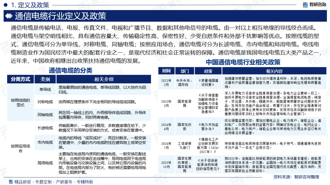 相关政策:电线电缆制造业作为国民经济中最大的配套行业之一,是现代经济和社会正常运转的保障。通信电缆是我国电线电缆五大类产品之一,近年来,中国政府相继出台政策扶持通信电缆的发展。例如,2024年7月,工信部等九部门印发《精细化工产业创新发展实施方案(2024-2027年)》,持续推进高压电缆绝缘及屏蔽材料、电子特气、微通道等先进技术及产品“一条龙”应用示范。2025年10月,国家发展改革委、国家能源局印发《关于促进新能源消纳和调控的指导意见》,提出到2035年,适配高比例新能源的新型电力系统基本建成,新能源消纳调控体系进一步完善,全国统一电力市场在新能源资源配置中发挥基础作用,新能源在全国范围内优化配置、高效消纳,支撑实现国家自主贡献目标。