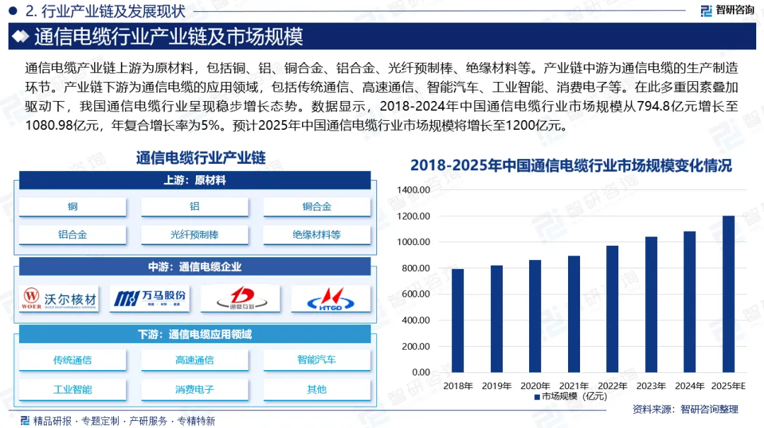 通信电缆是传输电话、电报、传真文件、电视和广播节目、数据和其他电信号的电缆。由一对以上相互绝缘的导线绞合而成。通信电缆与架空明线相比,具有通信容量大、传输稳定性高、保密性好、少受自然条件和外部干扰影响等优点。按照线缆的型式,通信电缆可分为单导线、对称电缆、同轴电缆;按照应用场合,通信电缆可分为长途电缆、市内电缆和局用电缆。通信电缆是现代通信系统的核心基础设施,专门用于传输电信号或光信号。当前,我国正处于5G网络深度覆盖、千兆光网加速普及以及“双千兆”网络协同发展的关键阶段,为通信电缆行业提供了强劲的市场需求背景。根据工信部数据,截至2025年10月末,三家基础电信企业的固定互联网宽带接入用户总数达6.97亿户,比2024年末净增2701万户。截至10月末,三家基础电信企业发展移动物联网终端用户28.9亿户,比2024年末净增2.34亿户。互联网用户数量的持续增加和移动互联网的普及,使得数据流量呈指数级增长,带动了通信基础设施的建设和升级,增加了对通信电缆的需求。与此同时,5G技术的规模化商用与网络深度覆盖,需要海量的通信电缆来支撑密集的基站建设和广泛的网络部署。此外,工业互联网、物联网等新兴产业的蓬勃发展,不断拓展通信电缆在智能制造、智慧城市、车联网等多元化场景中的应用,为行业增长注入了新的、持久的动力。在此多重因素叠加驱动下,我国通信电缆行业呈现稳步增长态势。数据显示,2018-2024年中国通信电缆行业市场规模从794.8亿元增长至1080.98亿元,年复合增长率为5%。预计2025年中国通信电缆行业市场规模将增长至1200亿元。中国通信线缆行业竞争格局呈现高度市场化的特征。市场由少数几家产品线完整、技术领先的全国性龙头企业,与众多专注于区域或细分产品的中小型企业共同构成。龙头企业凭借规模、品牌与研发优势,主导主流市场与重大工程项目;而中小型企业则依靠灵活性和特定领域的深耕,在局部市场展开竞争。当前,行业竞争正从价格层面,加速向产品技术升级、材料创新(如铝合金替代)及综合解决方案能力等维度深化。目前,中国通信电缆行业代表企业包括深圳市沃尔核材股份有限公司、浙江万马股份有限公司、江苏亨通光电股份有限公司、通鼎互联信息股份有限公司、神宇通信科技股份公司、山东新能泰山发电股份有限公司、江苏中天科技股份有限公司、深圳金信诺高新技术股份有限公司、江西联创光电科技股份有限公司、江苏永鼎股份有限公司等。