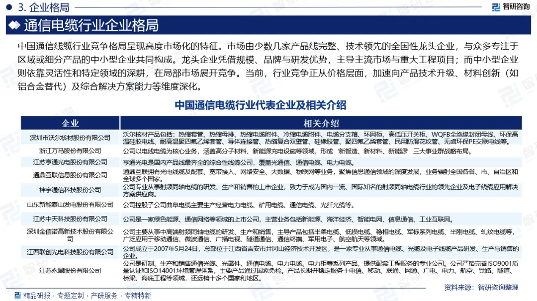 企业格局:中国通信线缆行业竞争格局呈现高度市场化的特征。市场由少数几家产品线完整、技术领先的全国性龙头企业,与众多专注于区域或细分产品的中小型企业共同构成。龙头企业凭借规模、品牌与研发优势,主导主流市场与重大工程项目;而中小型企业则依靠灵活性和特定领域的深耕,在局部市场展开竞争。当前,行业竞争正从价格层面,加速向产品技术升级、材料创新(如铝合金替代)及综合解决方案能力等维度深化。目前,中国通信电缆行业代表企业包括深圳市沃尔核材股份有限公司、浙江万马股份有限公司、江苏亨通光电股份有限公司、通鼎互联信息股份有限公司、神宇通信科技股份公司、山东新能泰山发电股份有限公司、江苏中天科技股份有限公司、深圳金信诺高新技术股份有限公司、江西联创光电科技股份有限公司、江苏永鼎股份有限公司等。