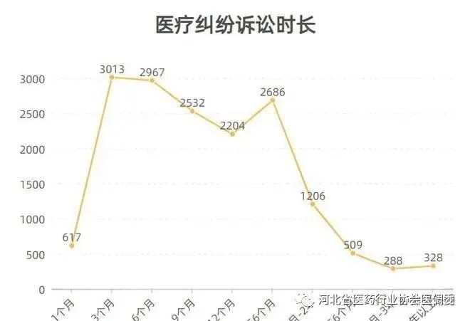 统计的数据显示,大多数医疗纠纷案件花费的诉讼时长在1个月至1年6个月之间,3个月至1年6个月的案件占据主要区间,仅小部分的案件审理期限少于1个月或者超过2年,可以看出基于治疗周期长,检验鉴定需要时间等因素,医疗案件审理周期普遍较长。