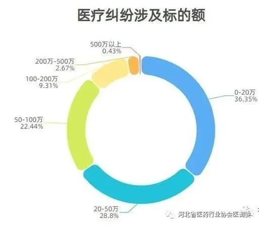 统计的数据显示,医疗行业所涉纠纷标的额在20万以下的占比为36.35%,20万-100万区间的案件数量最多,相加约为52%,200万以上标的额的案件数量最少,仅有3%左右。