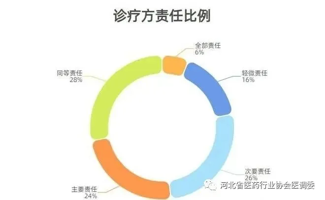 统计的数据显示,医疗纠纷案件中,法院判决诊疗方承担责任的比例分布为:诊疗方全部责任(6%),同等责任(28%),主要责任(24%),次要责任(26%),轻微责任(16%),可以看出,诊疗方主要承担的责任范围是同等责任和次要责任,诊疗方占比全部责任的比例极低。原因在于即使在确认诊疗方具有过错且需承担责任的情形之时,患者病情发生变化的情形无法精确预计,患者需要举证因诊疗方完全过错导致患者不良后果的因果关系也较困难,一般只有在误诊漏诊等诊疗方严重医疗过错的情形才能确认直接因果关系从而判决诊疗方承担全部责任。