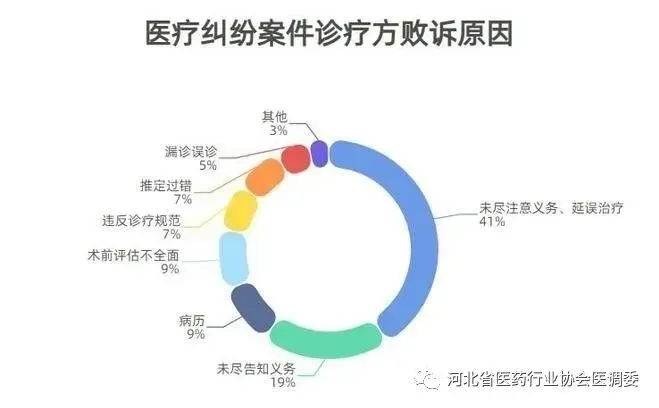 统计的数据显示,在医疗纠纷案件中,诊疗方败诉的原因大致包括:未尽注意义务、延误治疗,未尽告知义务,病历,术前评估不全面,违反诊疗规范,推定过错,漏诊误诊等。其中占比最多的原因是未尽注意义务、延误治疗达到总数的41%,其次是未尽告知义务,达到总数的19%。医疗机构对患者及其家属履行告知义务的主要载体病历材料记录不完整、书写不规范,且目前医疗机构对患者及其家属的告知多为形式上的告知,不注重告知义务的全面履行,这也使医疗机构更容易被认定存在未尽告知义务的过错。