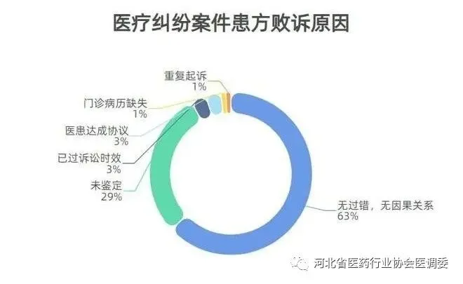 统计的数据显示,医疗纠纷案件中导致患者败诉的原因大致可以分为:无过错、无因果关系,未鉴定,已过诉讼时效,医患达成协议,门诊病历缺失,重复起诉。其中最主要的原因是无过错、无因果关系,占比63%,因实践中医疗纠纷因果关系的认定与举证密切相关需要其次是未鉴定,占比29%,这二者总共占比就达到了92%。有1%的案件是因为患方丢失门诊病历材料,从而导致举证不能,使自身陷于不利的诉讼地位。