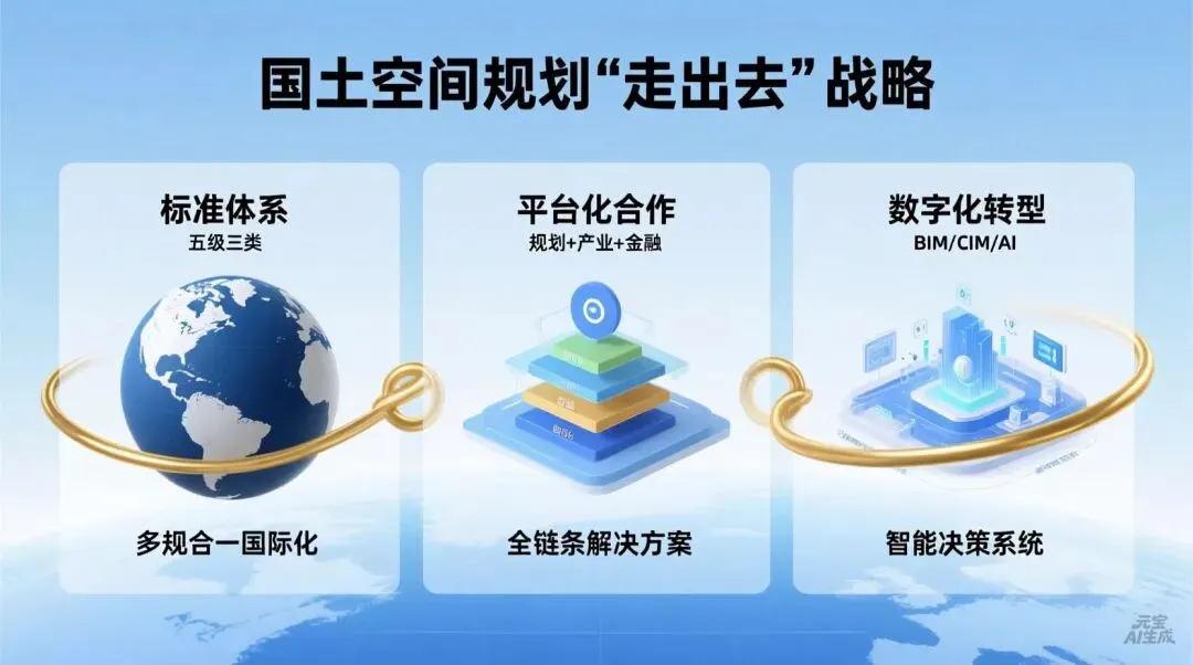 1. 标准体系的“中国方案”:依托国内成熟的“五级三类”规划体系,推动“多规合一”理念国际化。重点输出国土空间用途管制、生态保护修复等核心标准,将中国的空间治理经验转化为国际通用的技术语言,抢占全球空间治理的规则制定权。
