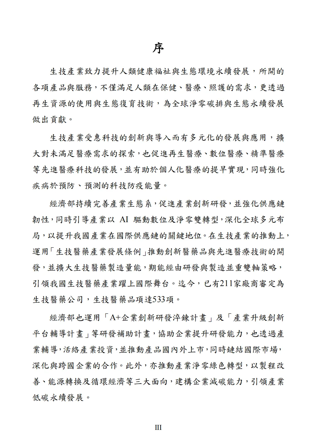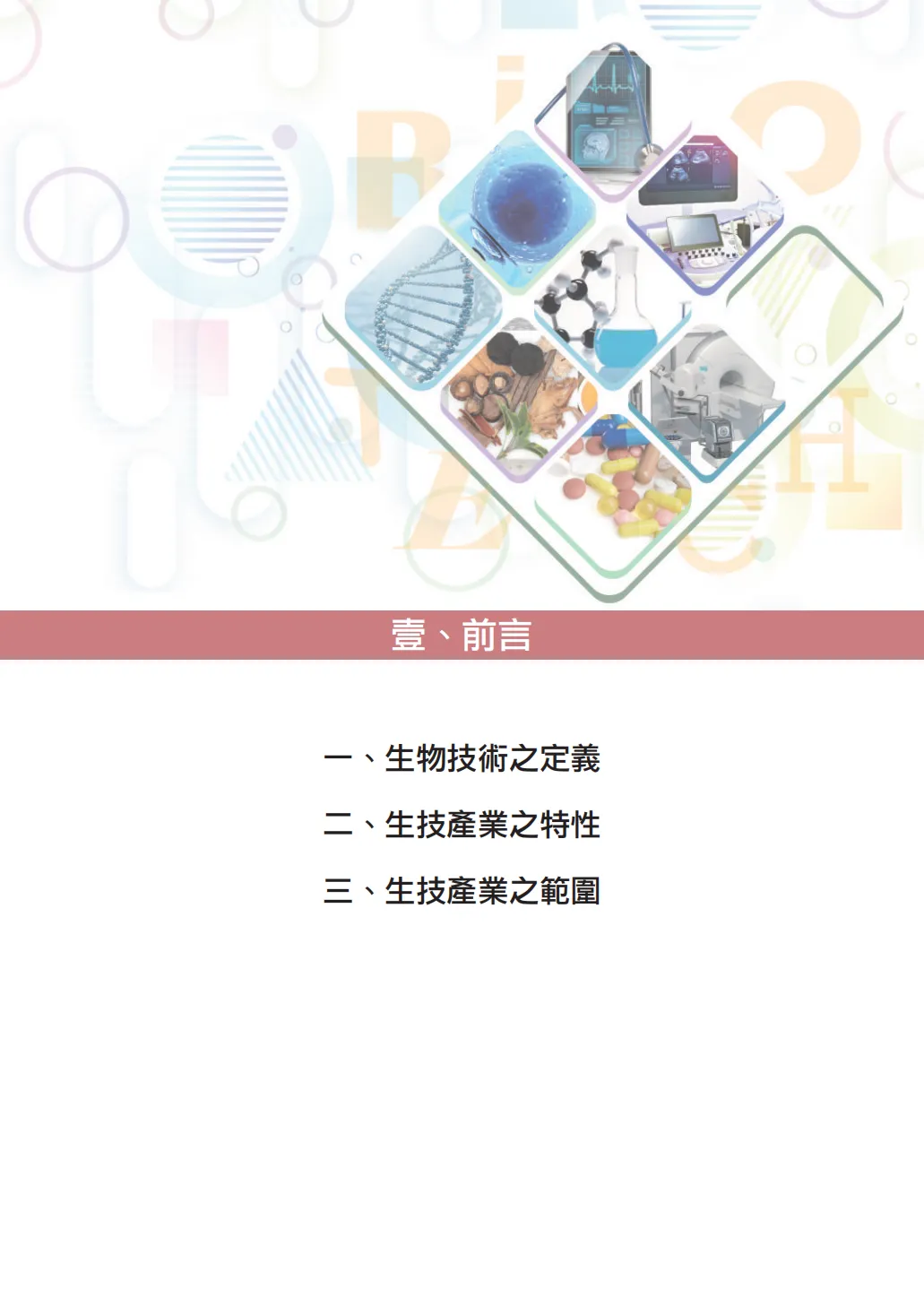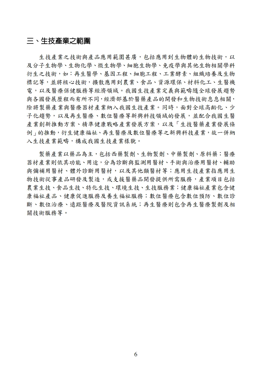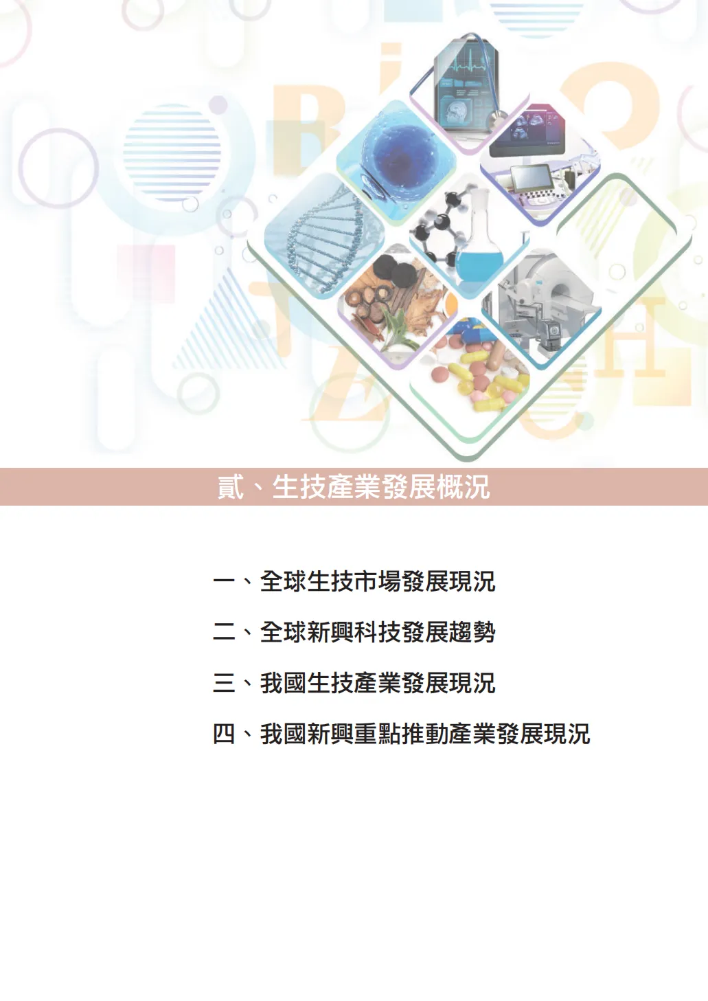 生技產業致力於提升人類健康福祉與生態環境永續發展,其運用生物技術,開發醫藥品、保健營養食品、培育添加營養價值的農產品、潔淨用水、生質能源,以及輔助精準用藥與協助疾病預防與預測的基因定序與檢測及生物標記等產品與服務,滿足人類在保健、醫療、照護之全齡健康的需求,並透過再生資源的使用與各種減碳及碳捕捉技術的發展,期望能打造出全齡健康與淨零碳排的永續發展社會。