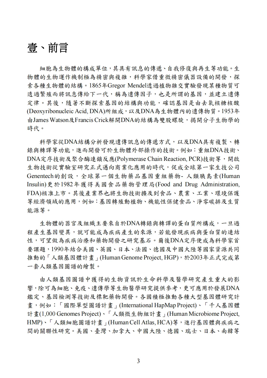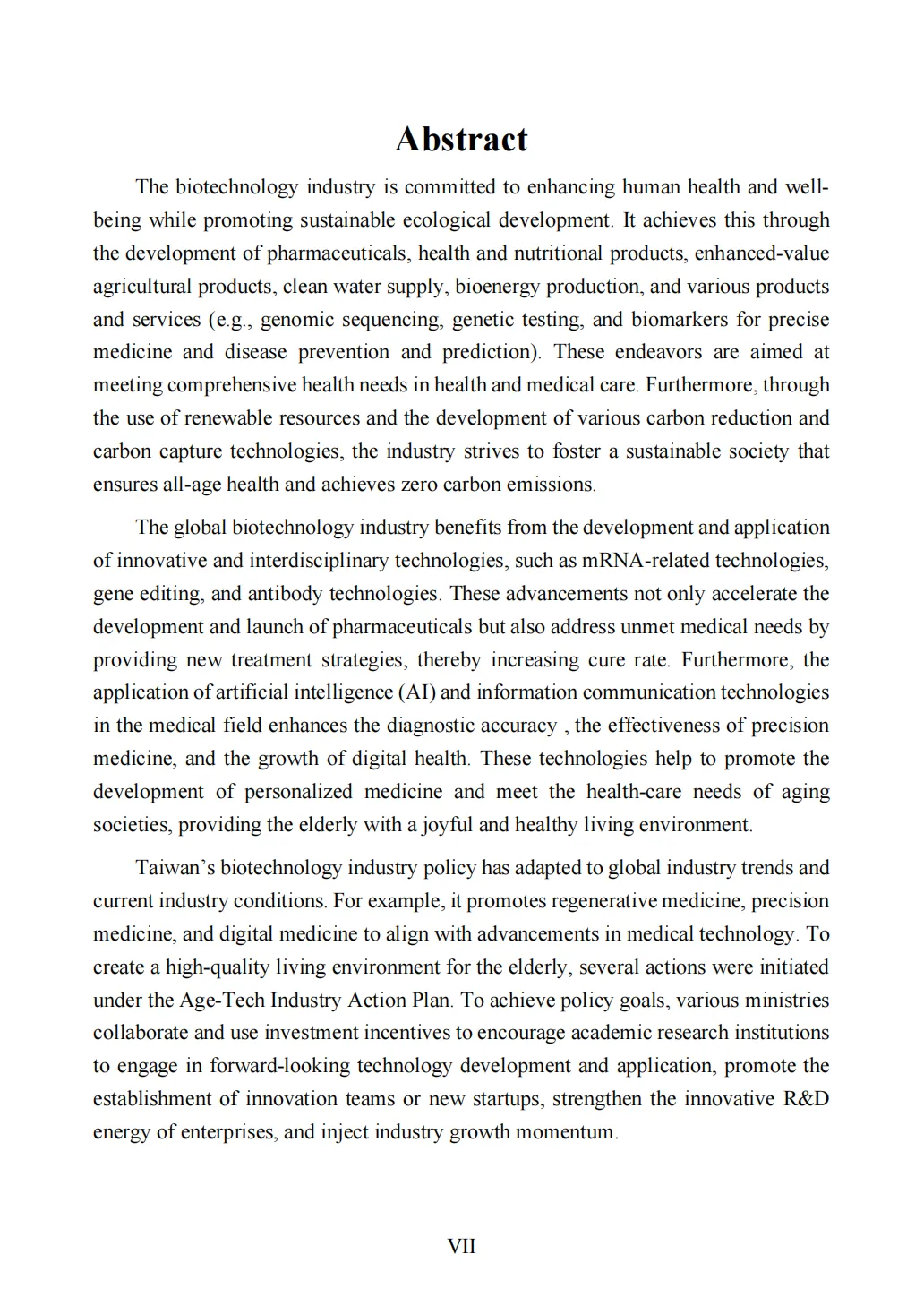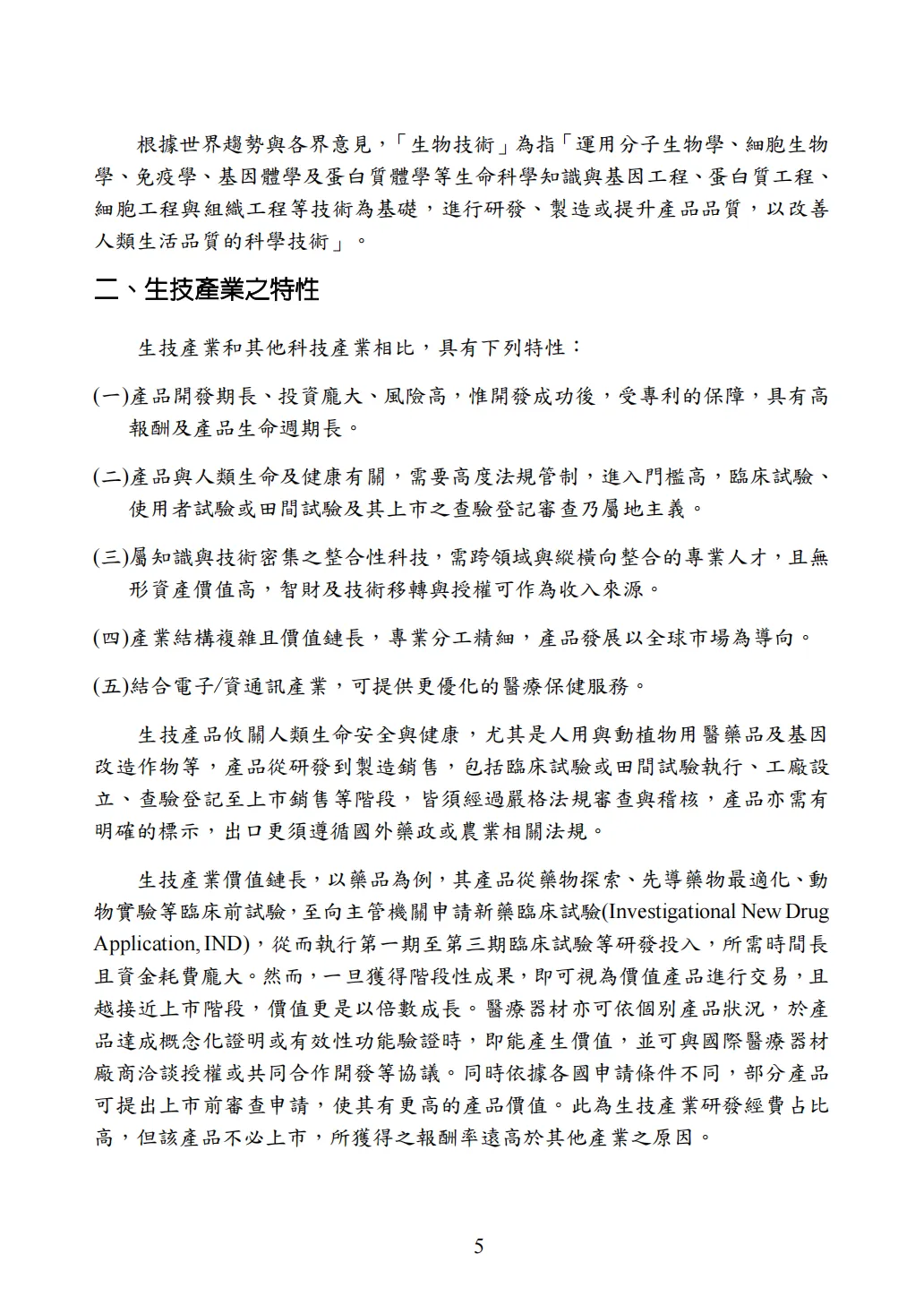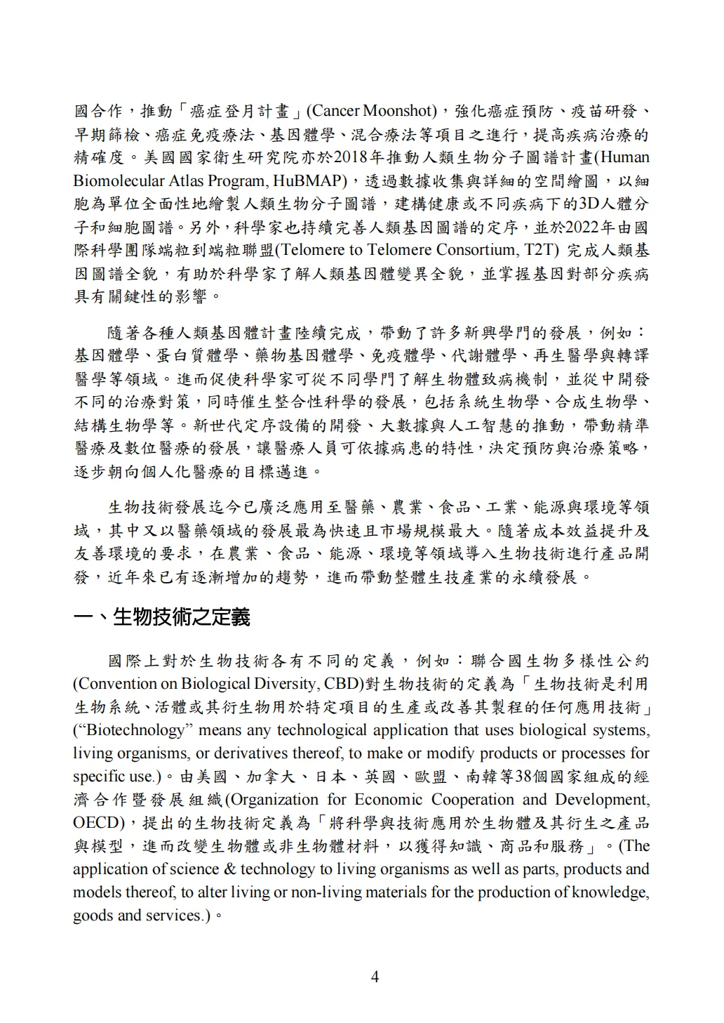 生技產業致力於提升人類健康福祉與生態環境永續發展,其運用生物技術,開發醫藥品、保健營養食品、培育添加營養價值的農產品、潔淨用水、生質能源,以及輔助精準用藥與協助疾病預防與預測的基因定序與檢測及生物標記等產品與服務,滿足人類在保健、醫療、照護之全齡健康的需求,並透過再生資源的使用與各種減碳及碳捕捉技術的發展,期望能打造出全齡健康與淨零碳排的永續發展社會。
