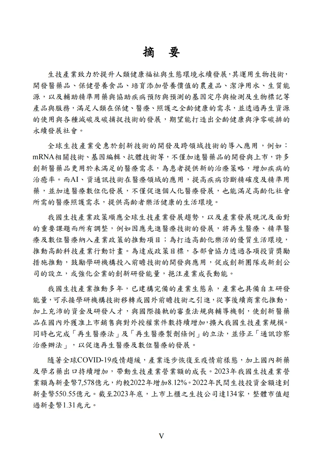 隨著全球COVID-19疫情趨緩,產業逐步恢復至疫情前樣態,加上國內新藥及學名藥出口持續增加,帶動生技產業營業額的成長。2023年我國生技產業營業額為新臺幣7,578億元,約較2022年增加8.12%。2022年民間生技投資金額達到新臺幣550.55億元。截至2023年底,上市上櫃之生技公司達134家,整體市值超過新臺幣1.31兆元。