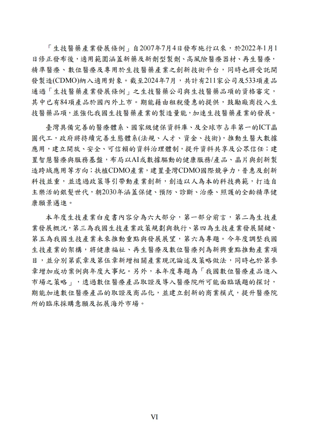 我國生技產業政策順應全球生技產業發展趨勢,以及產業發展現況及面對的重要課題而所有調整,例如因應先進醫療技術的發展,將再生醫療、精準醫療及數位醫療納入產業政策的推動項目;為打造高齡化樂活的優質生活環境,推動高齡科技產業行動計畫。為達成政策目標,各部會協力透過各項投資獎勵措施推動,鼓勵學研機構投入前瞻技術的開發與應用,促成創新團隊或新創公司的設立,或強化企業的創新研發能量,挹注產業成長動能。