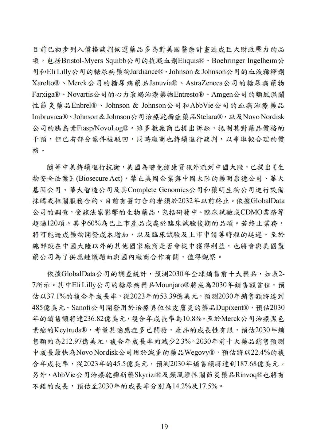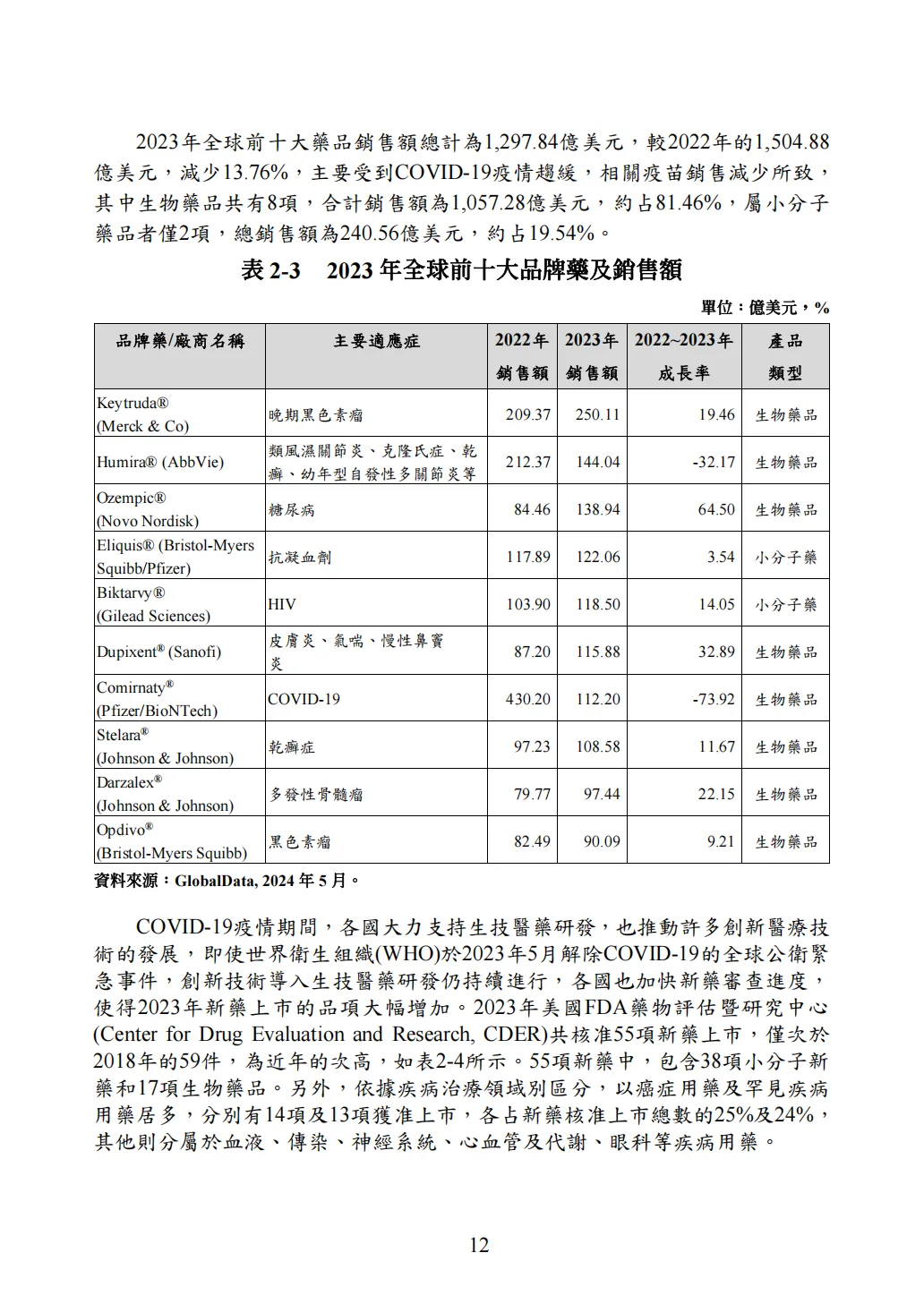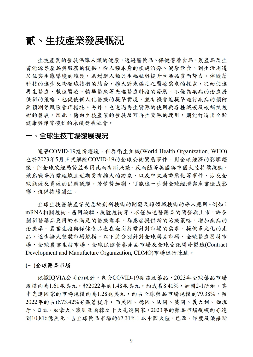 全球生技產業受惠於創新技術的開發及跨領域技術的導入應用,例如:mRNA相關技術、基因編輯、抗體技術等,不僅加速醫藥品的開發與上市,許多創新醫藥品更用於未滿足的醫療需求,為患者提供新的治療策略,增加疾病的治癒率。而AI、資通訊技術在醫療領域的應用,提高疾病診斷精確度及精準用藥,並加速醫療數位化發展,不僅促進個人化醫療發展,也能滿足高齡化社會所需的醫療照護需求,提供高齡者樂活健康的生活環境。