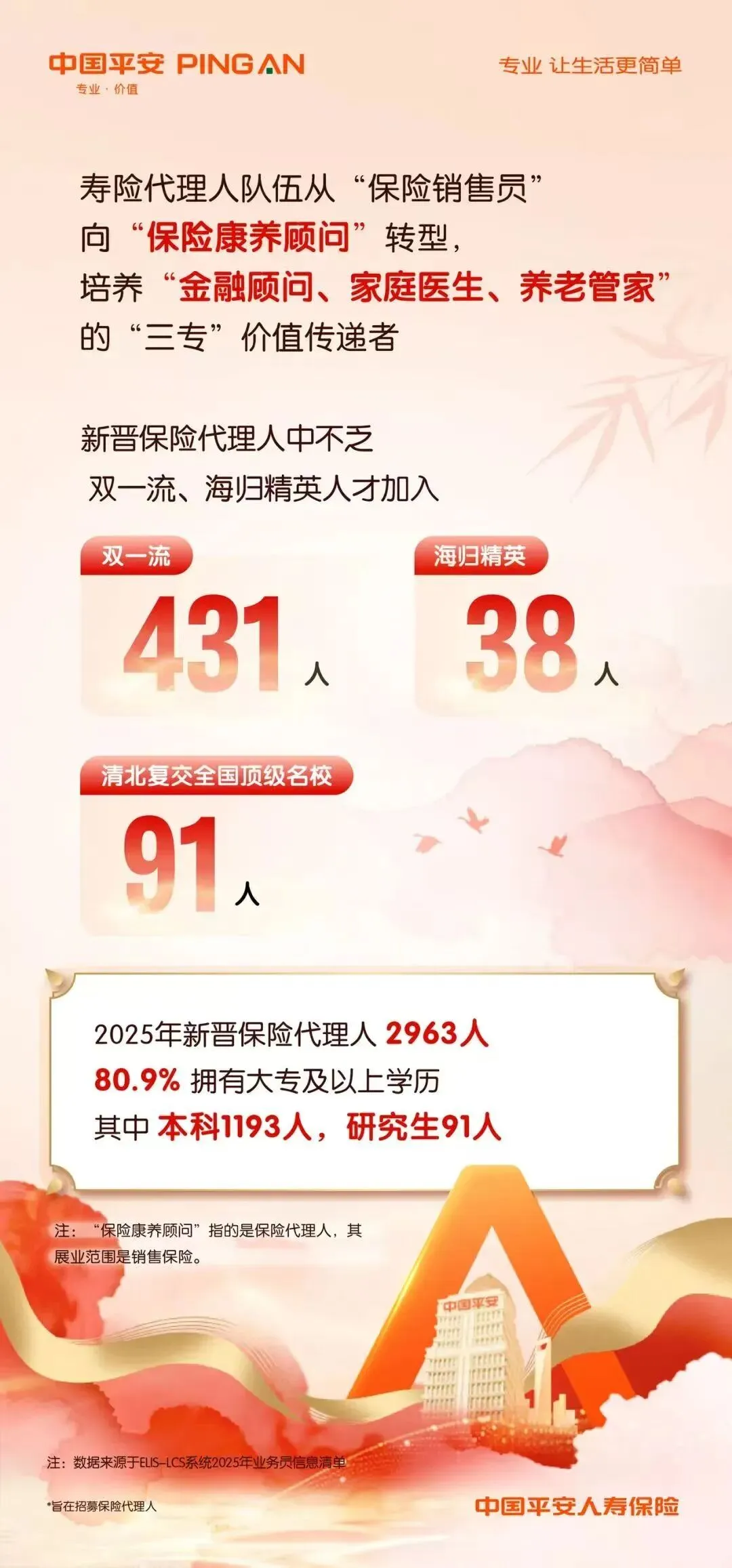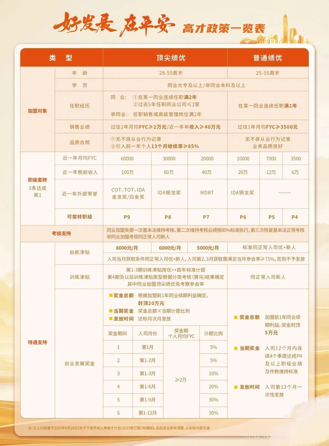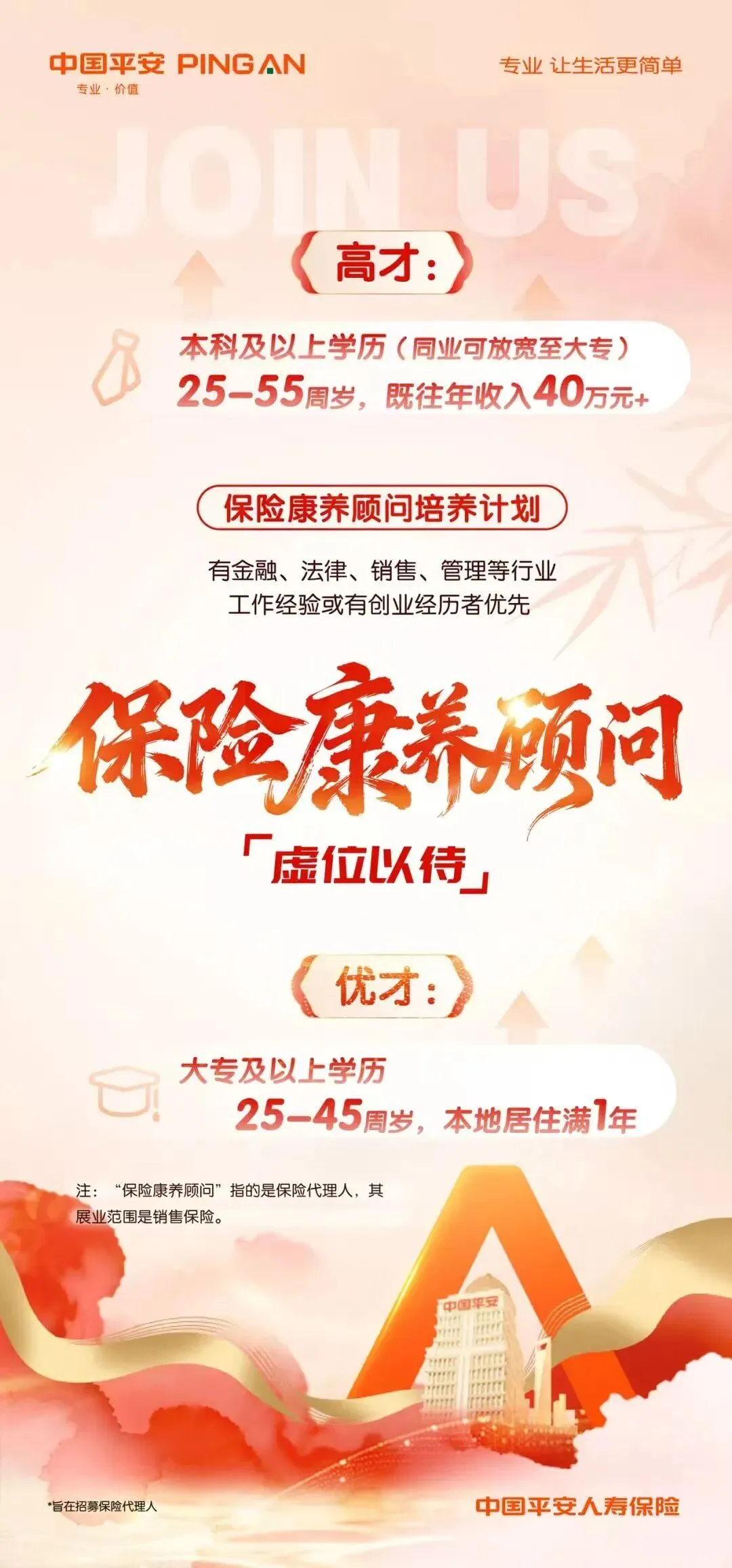 平安人寿保险康养顾问·高才计划(2025年6月试点,2026年2月全面启动),是平安代理人队伍高质量转型的顶层精英招募与培养项目,定位为顶尖保险康养顾问,服务高净值客户 。