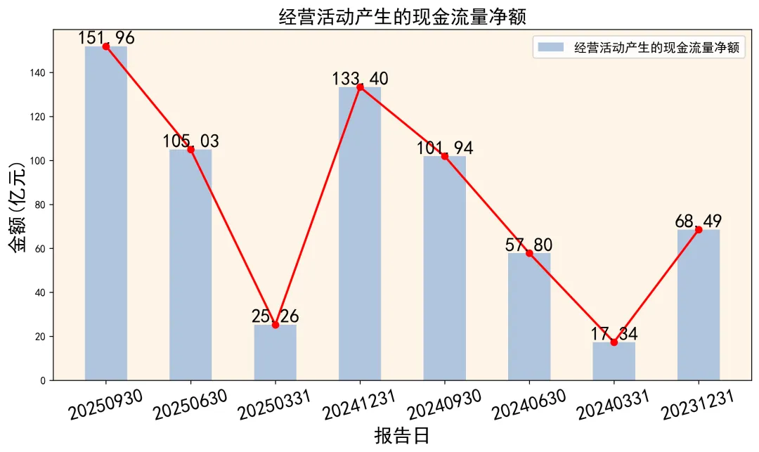 - 经营现金流强劲:前三季度净流入 151.96亿元,是净利润(54.17亿元)的 2.8倍。这说明利润是真金白银赚回来的,造血功能强大。