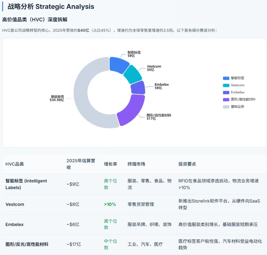 三月初,艾利丹尼森(Avery Dennison)发布了2025年财报。作为全球压敏标签材料的绝对龙头,这家年营收88.56亿美元的老牌巨头,正在经历一场静默的转型---其"高价值品类"(High-Value Categories,简称HVC)占比已经提升到45%,其中智能标签(Intelligent Labels,即RFID标签业务)贡献了约9亿美元营收。