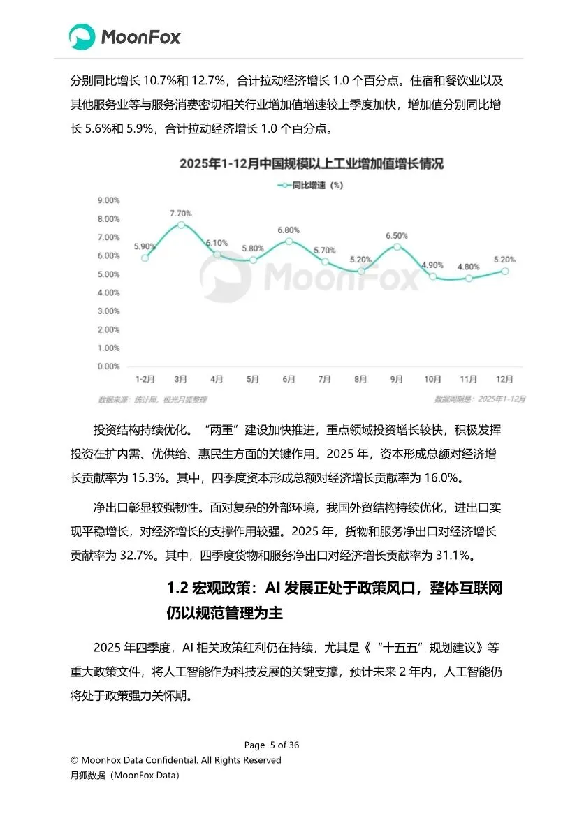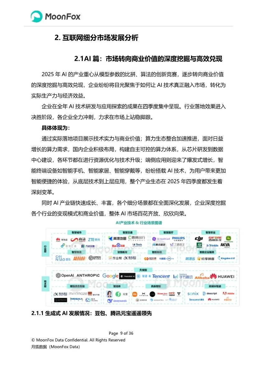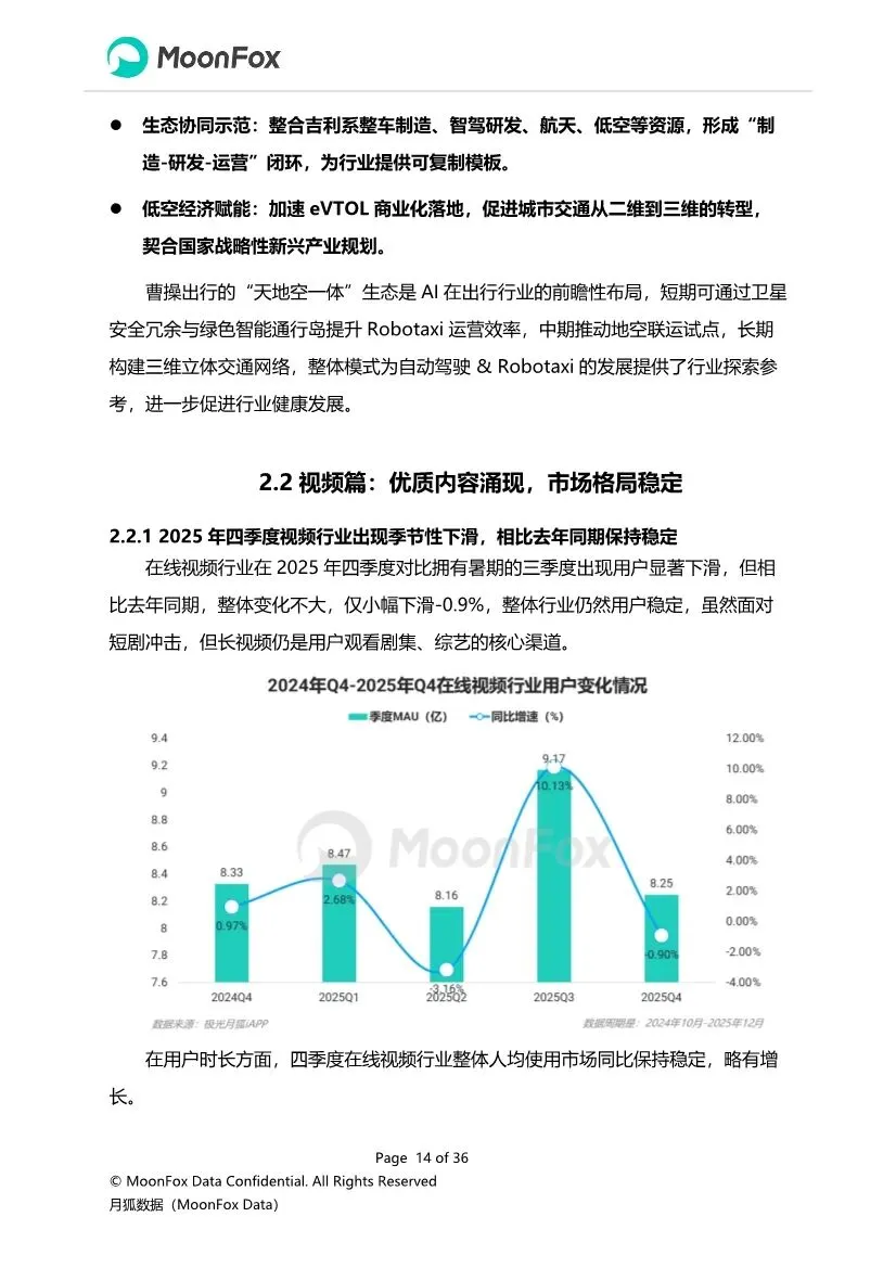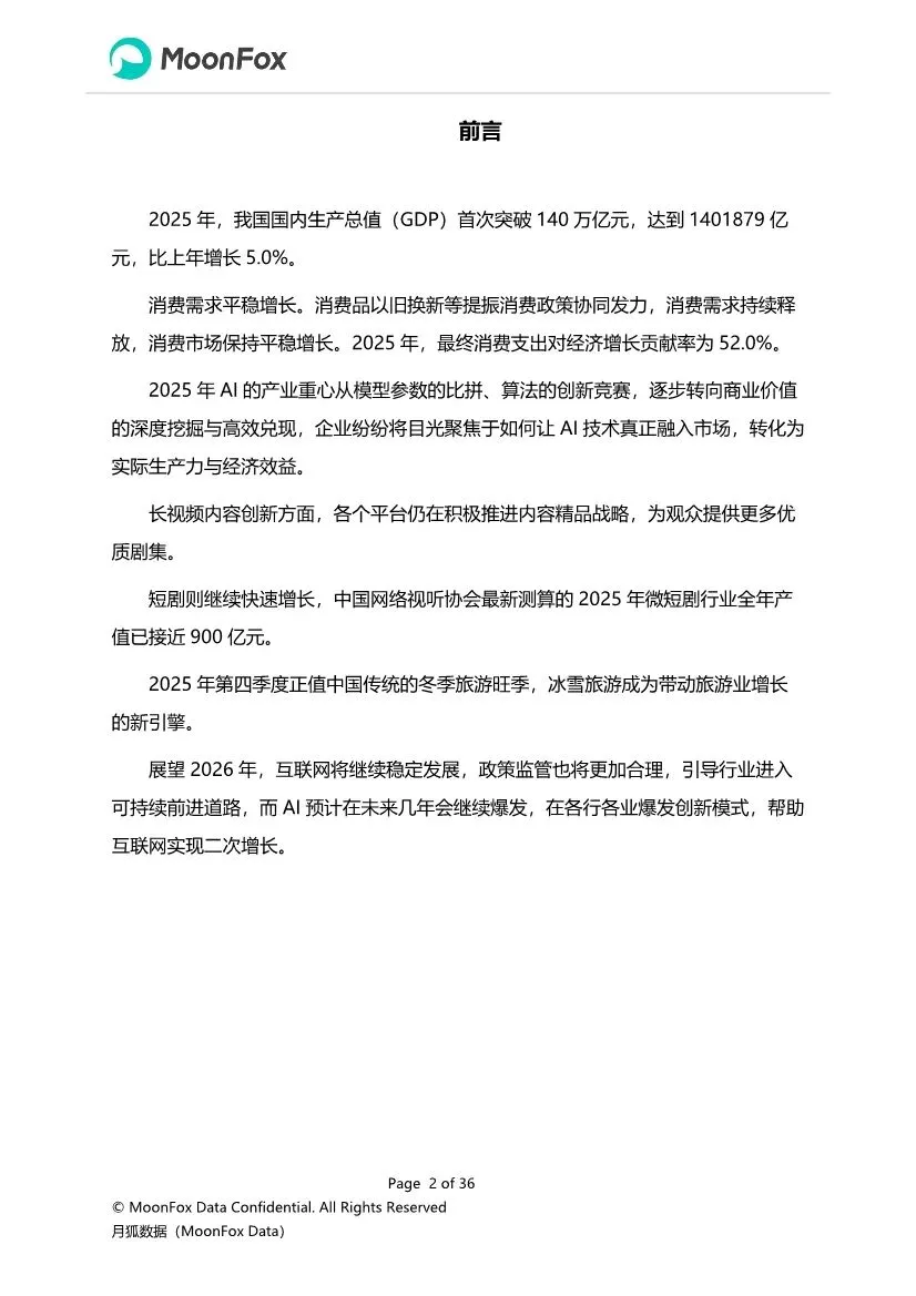 本报告由极光月狐数据(MoonFox Data)于2026年2月发布,核心聚焦2025年第四季度及全年中国移动互联网行业的宏观趋势与细分市场动态。以下是对其核心内容的梳理与解读: ◦ 2025年全年GDP首次突破140万亿元,同比增长5.0%。其中第四季度同比增长4.5%。 ◦ 消费是经济增长的最大贡献者(全年贡献率52.0%),以旧换新等政策效果显著。 ◦ 产业结构上,第三产业(服务业) 贡献突出(四季度贡献率63.2%),信息软件、租赁商务等现代服务业增长迅速。2. 宏观政策“双轨制”:大力扶持AI,持续规范互联网: ◦ AI处于强政策风口:“人工智能+”上升为国家战略(写入“十五五”规划),目标到2027年实现与六大重点领域广泛融合。游戏电竞产业也迎来多地政策回暖(如上海、广州)。 ◦ 互联网强监管常态化:聚焦数据安全(《个人信息出境认证办法》)与公平竞争(新《反不正当竞争法》),为行业划定清晰红线,引导可持续发展。3. 互联网流量变化:存量竞争加剧,下沉与物联网是增量: ◦ 用户规模见顶:移动设备数达12.99亿,四季度用户使用时长相比暑期(三季度)出现下滑,表明市场已彻底进入存量深耕阶段。 ▪ 下沉市场:农村宽带用户持续增长(达2.04亿户),仍有渗透空间。 ▪ 物联网:移动物联网终端用户(28.88亿户)已远超移动电话用户,成为重要的增长极。 ▪ 流量消费:月户均流量(DOU)持续攀升至20.74GB/户·月,用户对网络的重度依赖未变。二、 细分市场发展分析:AI领衔变革,多领域纵深发展• 产业重心转移:报告明确,2025年AI产业重心从“模型参数比拼”转向 “商业价值的深度挖掘与高效兑现”。 ◦ 市场格局:豆包(MAU 2.06亿)和腾讯元宝(MAU 1.06亿)在C端用户规模上领先。腾讯元宝的策略值得关注:通过接入腾讯混元与DeepSeek实现“双模型驱动”,并深度协同微信、QQ等腾讯生态,构建生态化壁垒。 ◦ 技术演进:应用场景从办公向工业、自动驾驶等实体领域延伸。豆包1.8版本在Agent能力、长视频理解上进步显著。• 行业落地典范——大出行:报告以“AI+大出行”为例,说明AI如何与产业结合。曹操出行的案例被重点分析,其依托吉利生态,构建“天地空一体”(卫星+自动驾驶+低空飞行)的Robotaxi模式,展示了AI在复杂场景下解决安全与运营难题的前瞻性探索。• 市场态势:四季度用户规模同比微降0.9%,格局稳定。腾讯视频、爱奇艺、哔哩哔哩、优酷视频、芒果TV稳居前五,进入成熟期竞争。 ◦ 提质减量:全年S+级长剧41部,但TOP20剧集总播放量同比缩减20%,显示平台更聚焦头部精品。 ◦ 口碑与创新:优酷《反人类暴行》(豆瓣8.9分)成为年度口碑标杆;爱奇艺对“唐诡”IP进行全矩阵开发,探索迪士尼式的场域共振模式。 ◦ 核心问题:题材同质化、跟风现象仍是长视频行业痛点。• 未来趋势:长短融合(如B站中视频)与AI赋能创作(从生成到优化)将成为关键发展方向。• 政策环境:监管政策密集出台,聚焦产品质量安全、平台公平治理和直播电商规范,推动行业走向合规化与高质量。• 行业现状:用户规模达11.66亿,增长稳定。直播电商持续冲击传统格局。 ◦ 阿里巴巴:明确“科技+消费”双平台定位,推动天猫与淘宝闪购协同,发力即时零售与跨境电商。 ◦ 京东:上线外卖APP切入即时零售,并深化AI应用以强化供应链优势。• 趋势展望:智慧化转型、场景融合(电商+本地生活)、跨境与农村电商是主要方向。4. 旅游篇:政策红利释放,冰雪游与入境游引爆市场• 政策驱动:国家与地方层面出台多项政策提振文旅消费,推动交通与文旅融合,并放宽入境签证(如对俄罗斯公民试行免签)。 ◦ 冰雪旅游:成为冬季增长引擎,预计2024-2025雪季收入超7200亿元。 ◦ 入境旅游:迎来爆发,政策效果显著(如携程平台俄罗斯入境订单激增)。• 竞争格局:携程在用户规模上优势明显。飞猪等平台则通过发布AI智能体工具(分析、优化、营销、服务助手)赋能商家,提升行业效率。• 政策“两手抓”:国家层面强化审核,整治低俗违规内容;地方层面(上海、江苏、河南等)则推出真金白银的扶持政策,鼓励精品创作与产业发展。• 行业持续高增长:2025年产值已近900亿元,用户规模达6.96亿,覆盖全年龄段。四季度颁发发行许可691部,占全年43.9%。• 平台动作:抖音通过“万象计划”、非遗扶持等多项计划与流量倾斜,巩固其在短剧生态中的主导地位,并利用AI工具降低创作门槛。• 发展趋势:告别粗放,走向精品化、差异化,并加速IP化开发和技术赋能。• 总体格局:社交网络用户覆盖达13.25亿,是移动互联网第一入口。微信占据绝对统治地位。 ◦ AI融合:腾讯重金引入AI科学家,旨在推动AI Agent与微信生态深度融合。 ◦ 监管收紧:婚恋社交平台因虚假宣传、格式条款等问题频遭处罚。 ◦ 冲刺上市:Soul、伊对等垂直社交平台在四季度再次冲击港股IPO。• 创新亮点——垂直社交:报告以红松APP为例,展示了在银发社交赛道的成功逻辑:通过AI技术降低创作与学习门槛(如“AI帮我写”),聚焦“兴趣社交+智慧学习”的深度场景融合,满足特定人群的精准需求。• 未来趋势:AI全面渗透社交全链路,社交形态趋向轻量化、场景化(“搭子文化”),垂直兴趣社区价值凸显。本报告描绘了一幅2025年底中国移动互联网行业的清晰图景:在宏观流量见顶的背景下,AI已成为驱动行业二次增长的核心引擎,并与各个垂直领域加速融合,从“工具”转变为“生产力”与“新