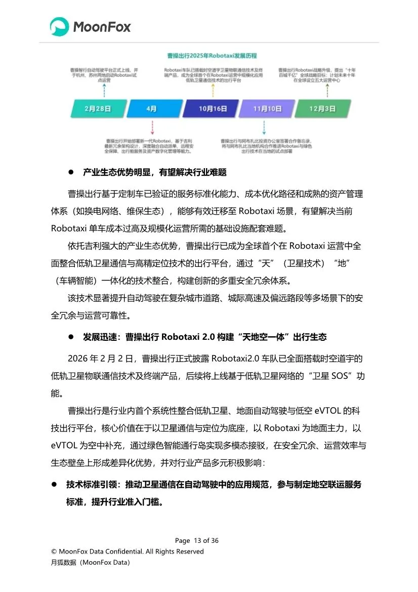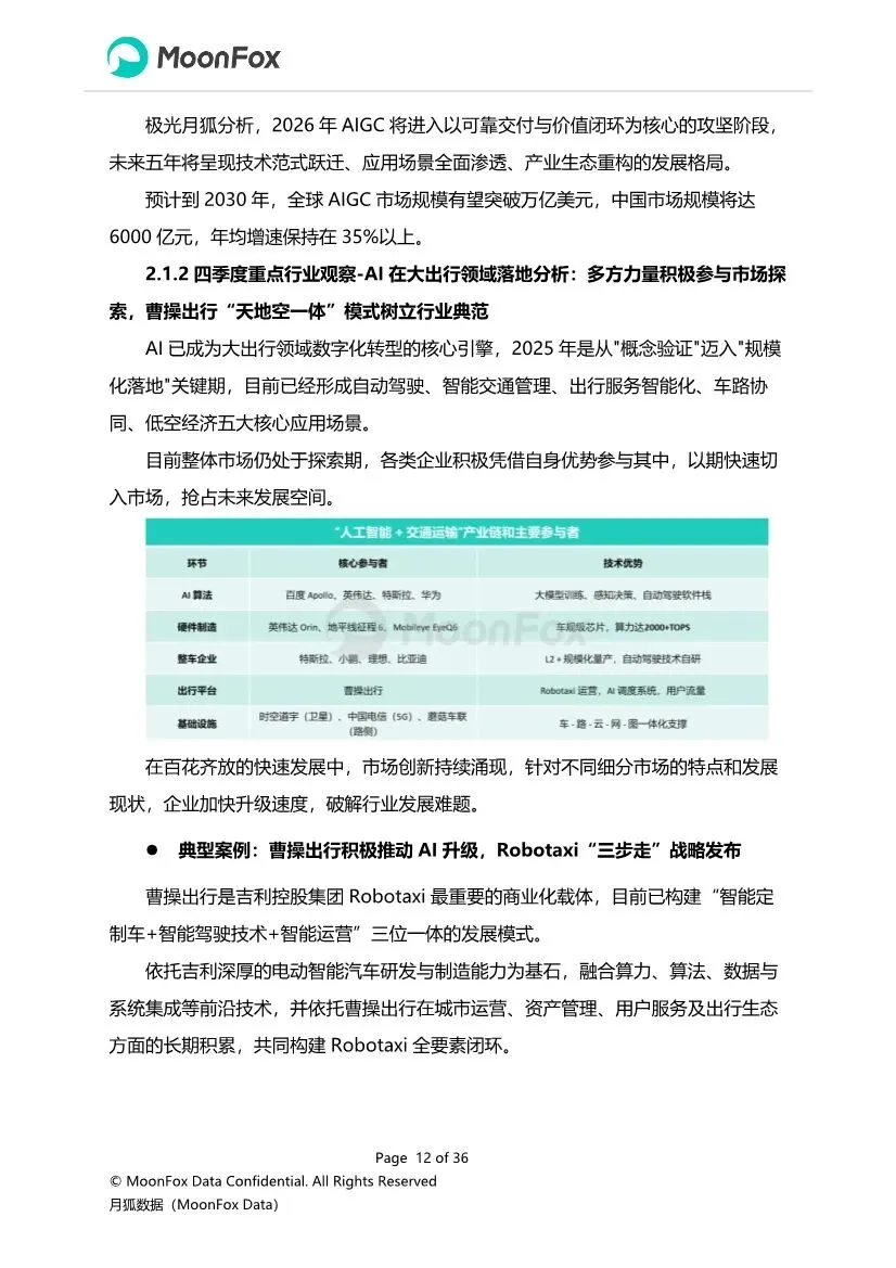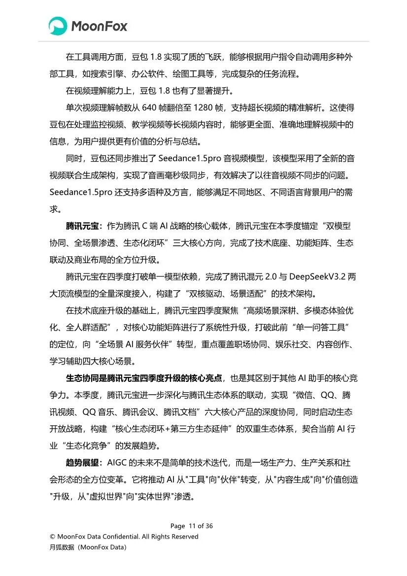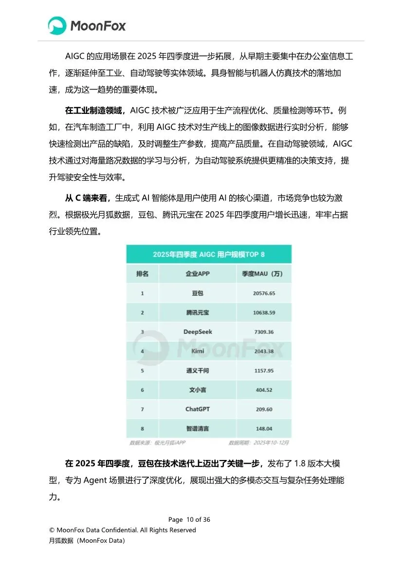 本报告由极光月狐数据(MoonFox Data)于2026年2月发布,核心聚焦2025年第四季度及全年中国移动互联网行业的宏观趋势与细分市场动态。以下是对其核心内容的梳理与解读: ◦ 2025年全年GDP首次突破140万亿元,同比增长5.0%。其中第四季度同比增长4.5%。 ◦ 消费是经济增长的最大贡献者(全年贡献率52.0%),以旧换新等政策效果显著。 ◦ 产业结构上,第三产业(服务业) 贡献突出(四季度贡献率63.2%),信息软件、租赁商务等现代服务业增长迅速。2. 宏观政策“双轨制”:大力扶持AI,持续规范互联网: ◦ AI处于强政策风口:“人工智能+”上升为国家战略(写入“十五五”规划),目标到2027年实现与六大重点领域广泛融合。游戏电竞产业也迎来多地政策回暖(如上海、广州)。 ◦ 互联网强监管常态化:聚焦数据安全(《个人信息出境认证办法》)与公平竞争(新《反不正当竞争法》),为行业划定清晰红线,引导可持续发展。3. 互联网流量变化:存量竞争加剧,下沉与物联网是增量: ◦ 用户规模见顶:移动设备数达12.99亿,四季度用户使用时长相比暑期(三季度)出现下滑,表明市场已彻底进入存量深耕阶段。 ▪ 下沉市场:农村宽带用户持续增长(达2.04亿户),仍有渗透空间。 ▪ 物联网:移动物联网终端用户(28.88亿户)已远超移动电话用户,成为重要的增长极。 ▪ 流量消费:月户均流量(DOU)持续攀升至20.74GB/户·月,用户对网络的重度依赖未变。二、 细分市场发展分析:AI领衔变革,多领域纵深发展• 产业重心转移:报告明确,2025年AI产业重心从“模型参数比拼”转向 “商业价值的深度挖掘与高效兑现”。 ◦ 市场格局:豆包(MAU 2.06亿)和腾讯元宝(MAU 1.06亿)在C端用户规模上领先。腾讯元宝的策略值得关注:通过接入腾讯混元与DeepSeek实现“双模型驱动”,并深度协同微信、QQ等腾讯生态,构建生态化壁垒。 ◦ 技术演进:应用场景从办公向工业、自动驾驶等实体领域延伸。豆包1.8版本在Agent能力、长视频理解上进步显著。• 行业落地典范——大出行:报告以“AI+大出行”为例,说明AI如何与产业结合。曹操出行的案例被重点分析,其依托吉利生态,构建“天地空一体”(卫星+自动驾驶+低空飞行)的Robotaxi模式,展示了AI在复杂场景下解决安全与运营难题的前瞻性探索。• 市场态势:四季度用户规模同比微降0.9%,格局稳定。腾讯视频、爱奇艺、哔哩哔哩、优酷视频、芒果TV稳居前五,进入成熟期竞争。 ◦ 提质减量:全年S+级长剧41部,但TOP20剧集总播放量同比缩减20%,显示平台更聚焦头部精品。 ◦ 口碑与创新:优酷《反人类暴行》(豆瓣8.9分)成为年度口碑标杆;爱奇艺对“唐诡”IP进行全矩阵开发,探索迪士尼式的场域共振模式。 ◦ 核心问题:题材同质化、跟风现象仍是长视频行业痛点。• 未来趋势:长短融合(如B站中视频)与AI赋能创作(从生成到优化)将成为关键发展方向。• 政策环境:监管政策密集出台,聚焦产品质量安全、平台公平治理和直播电商规范,推动行业走向合规化与高质量。• 行业现状:用户规模达11.66亿,增长稳定。直播电商持续冲击传统格局。 ◦ 阿里巴巴:明确“科技+消费”双平台定位,推动天猫与淘宝闪购协同,发力即时零售与跨境电商。 ◦ 京东:上线外卖APP切入即时零售,并深化AI应用以强化供应链优势。• 趋势展望:智慧化转型、场景融合(电商+本地生活)、跨境与农村电商是主要方向。4. 旅游篇:政策红利释放,冰雪游与入境游引爆市场• 政策驱动:国家与地方层面出台多项政策提振文旅消费,推动交通与文旅融合,并放宽入境签证(如对俄罗斯公民试行免签)。 ◦ 冰雪旅游:成为冬季增长引擎,预计2024-2025雪季收入超7200亿元。 ◦ 入境旅游:迎来爆发,政策效果显著(如携程平台俄罗斯入境订单激增)。• 竞争格局:携程在用户规模上优势明显。飞猪等平台则通过发布AI智能体工具(分析、优化、营销、服务助手)赋能商家,提升行业效率。• 政策“两手抓”:国家层面强化审核,整治低俗违规内容;地方层面(上海、江苏、河南等)则推出真金白银的扶持政策,鼓励精品创作与产业发展。• 行业持续高增长:2025年产值已近900亿元,用户规模达6.96亿,覆盖全年龄段。四季度颁发发行许可691部,占全年43.9%。• 平台动作:抖音通过“万象计划”、非遗扶持等多项计划与流量倾斜,巩固其在短剧生态中的主导地位,并利用AI工具降低创作门槛。• 发展趋势:告别粗放,走向精品化、差异化,并加速IP化开发和技术赋能。• 总体格局:社交网络用户覆盖达13.25亿,是移动互联网第一入口。微信占据绝对统治地位。 ◦ AI融合:腾讯重金引入AI科学家,旨在推动AI Agent与微信生态深度融合。 ◦ 监管收紧:婚恋社交平台因虚假宣传、格式条款等问题频遭处罚。 ◦ 冲刺上市:Soul、伊对等垂直社交平台在四季度再次冲击港股IPO。• 创新亮点——垂直社交:报告以红松APP为例,展示了在银发社交赛道的成功逻辑:通过AI技术降低创作与学习门槛(如“AI帮我写”),聚焦“兴趣社交+智慧学习”的深度场景融合,满足特定人群的精准需求。• 未来趋势:AI全面渗透社交全链路,社交形态趋向轻量化、场景化(“搭子文化”),垂直兴趣社区价值凸显。本报告描绘了一幅2025年底中国移动互联网行业的清晰图景:在宏观流量见顶的背景下,AI已成为驱动行业二次增长的核心引擎,并与各个垂直领域加速融合,从“工具”转变为“生产力”与“新