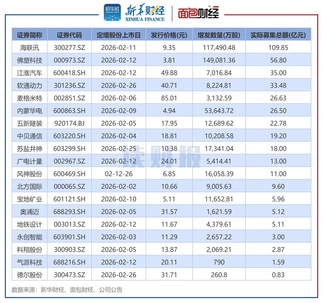 统计显示,2026年2月,A股上市公司共计实施定增19起,同比上升216.67%;实际募资总额约406.32亿元,同比上涨813.28%。其中,海联讯、佛塑科技、江淮汽车募资规模位居前三。