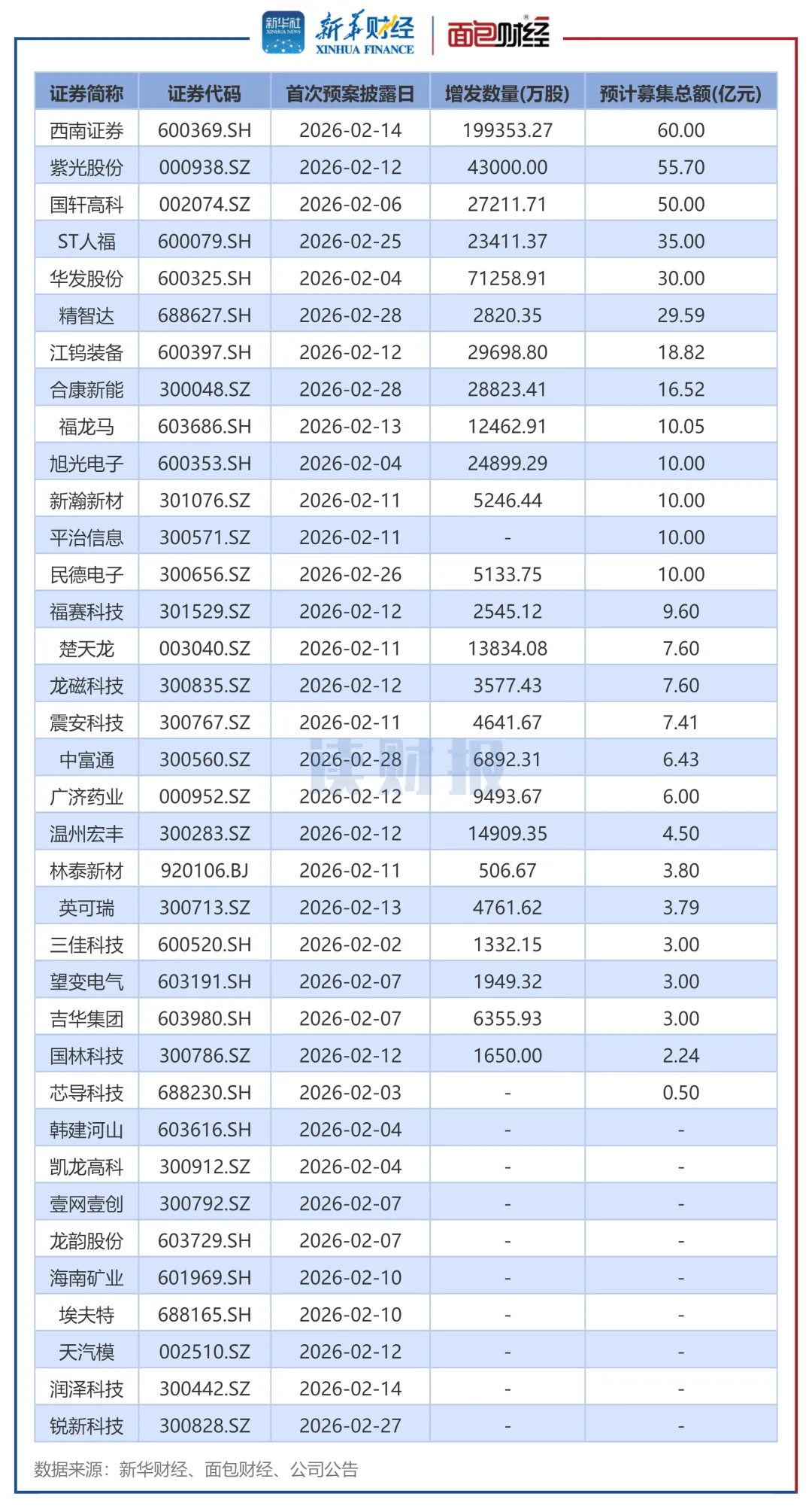 按照首次披露预案日口径统计,2026年2月A股上市公司定增预案发布数量共计36起,拟募资规模约414.14亿元,同比上升236.87%。其中,西南证券、紫光股份等企业拟募资规模相对靠前。