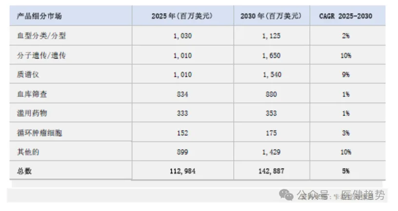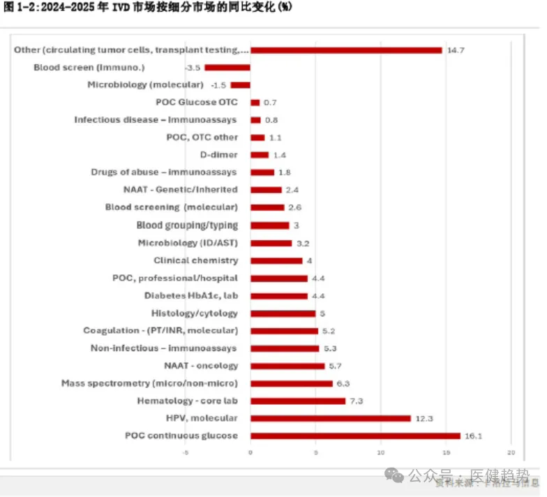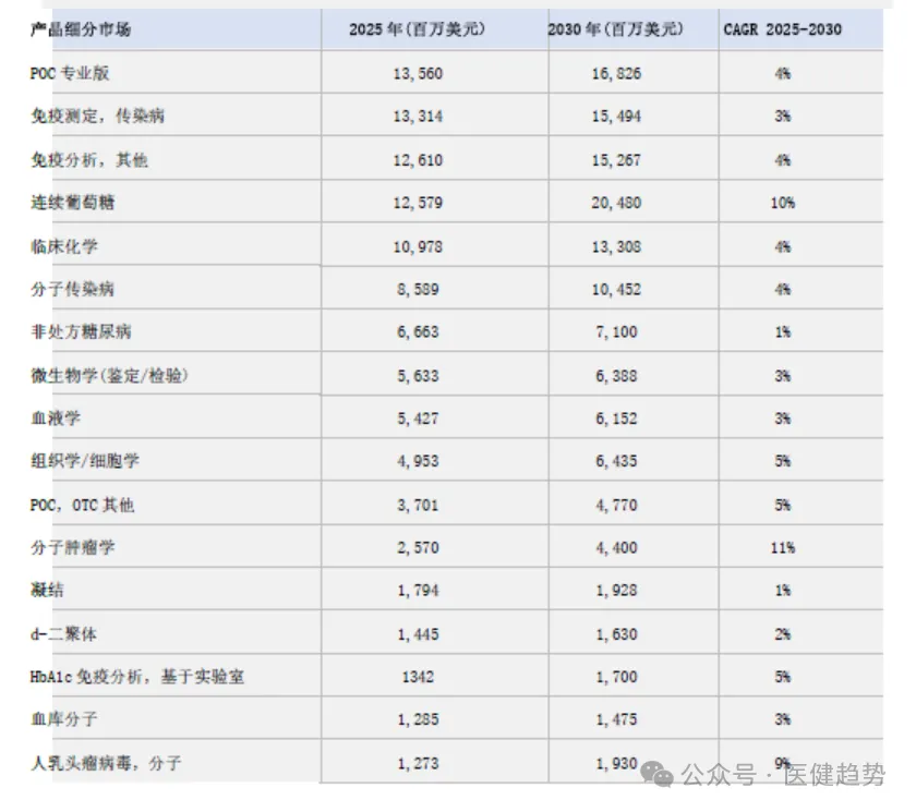 然而,所有公司或细分市场的增长并不一致。虽然一些常规检测领域的收入可能会持平或适度增长,但利用新技术的细分市场(如分子诊断、质谱、基因检测和先进的现场护理(POC)系统)有望超过整体市场平均水平。