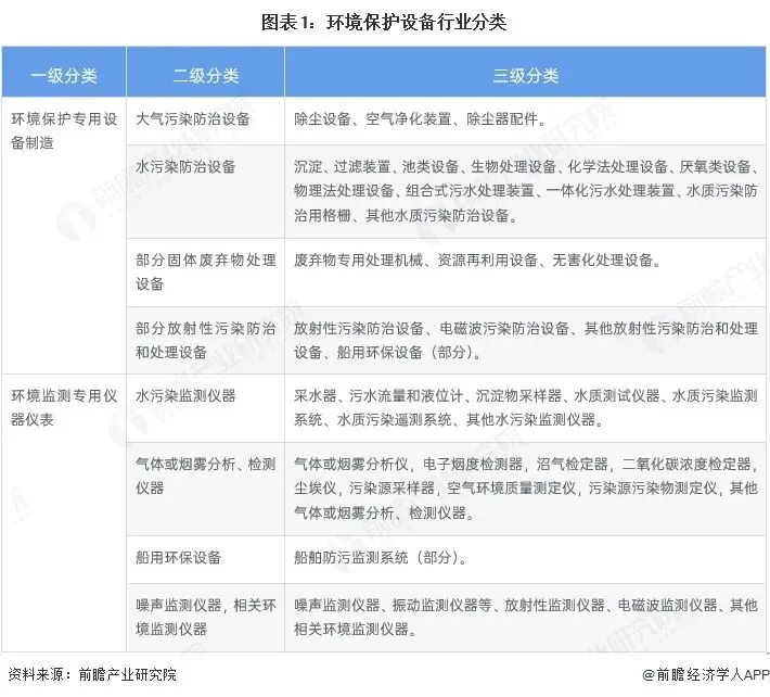 按照国家统计局的行业分类,环保设备行业主要包括环境保护专用设备制造、环境监测专用仪器仪表两类。