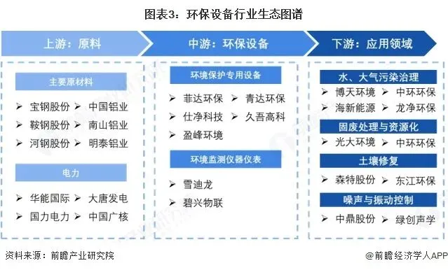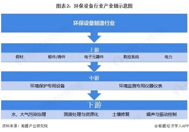 中国环保产业链的结构,主要包括上游市场即工业“三废”的排放,以及在生活中产生的废品,废水等。环保设备制造是中国环保产业链中的重要组成部分,其上游主要是生产设备所需的材料,例如,钢材、有色金属等原材料;中游主要是指环境保护专用设备和环境监测专用仪器仪表等,下游主要包括具体包含水污染治理、大气污染治理、固废处理与资源化等领域。