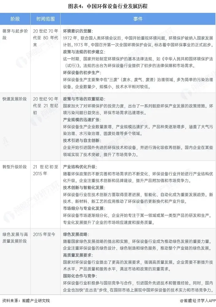 中国环保设备行业经历了从萌芽起步到快速发展、再到转型升级和绿色高质量发展的历程。未来,随着全球环保意识的不断提高和环保技术的不断创新,中国环保设备行业将迎来更加广阔的发展前景。