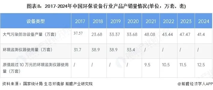 从行业整体情况来看,环保设备市场中的各类产品产销量情况整体呈现增长趋势,其中2024年大气污染防治设备产量为41.4万套。结合历史数据变动情况初步估计,原值超过10万元的环境监测仪器使用量约为12.5万套。
