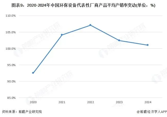 从环保设备代表性厂商产品平均产销率情况来看,2020-2023年代表性企业的平均产销率整体呈现增长趋势,2021-2024年均超过100%,其中2024年为101.0%,反映该行业代表型企业厂商的环保设备产品供不应求。