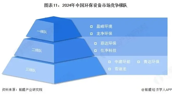 从中国环保设备参与者的业务收入情况来看,中国环保设备行业企业大致分为三个梯队。第一梯队的企业是盈峰环境、龙净环保,其营业收入较高,业务收入超过100亿元,在行业内的知名度和竞争力均较高,处于行业领先地位;第二梯队是有菲达环保、仕净科技等,这些企业专门从事某些方向的环保设备制造,且业务收入相对较高,在20-50亿元区间内;第三梯队有中建环能、青达环保、雪迪龙等,这些企业的业务收入在10-20亿元区间内。