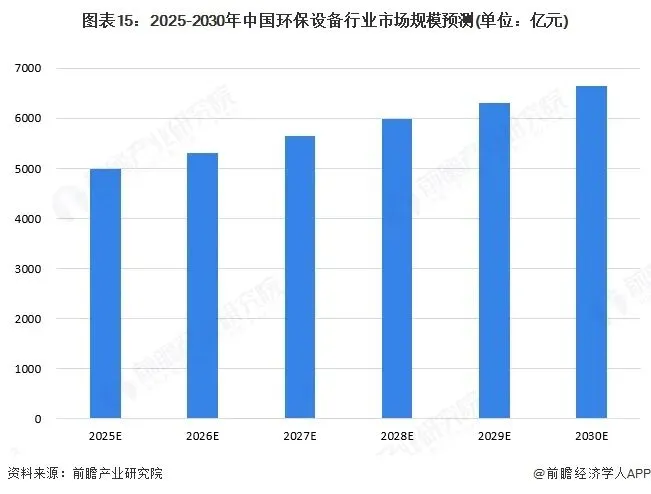 环保设备行业的发展前景较为广阔且充满机遇。随着全球对环境保护和可持续发展的重视程度不断提升,环保设备作为实现绿色转型的重要支撑,其市场需求将持续扩大。技术创新将不断推动环保设备向更高效、智能、绿色的方向发展,满足日益严格的环保标准和市场需求。同时,政府政策的支持和引导,以及社会各界的广泛关注,都将为环保设备行业提供强有力的发展动力。前瞻认为未来中国环保设备行业将稳步增长,预计2030年中国环保设备行业市场规模达到6647亿元,年均复合增长率约为5.9%。
