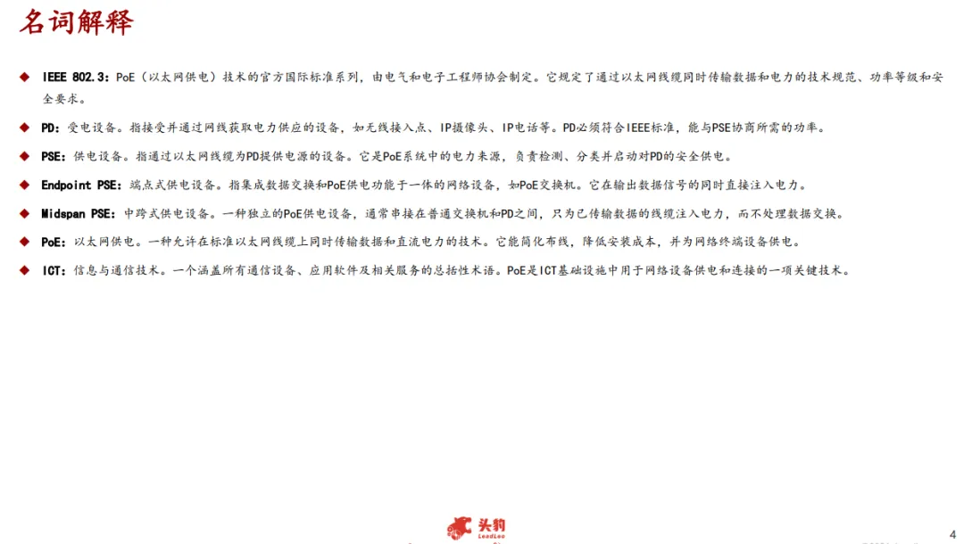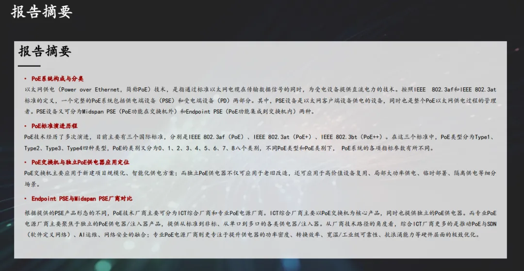 根据提供的PSE产品形态的不同,PoE技术厂商主要可分为ICT综合厂商和专业PoE电源厂商。ICT综合厂商主要以PoE交换机为核心产品,同时也提供独立的PoE供电器。而专业PoE电源厂商主要聚焦于独立的PoE供电器/注入器产品,提供从标准到非标、从单口到多口的各类供电器/注入器。从厂商技术路径的角度看,综合ICT厂商更多的是推动PoE与SDN(软件定义网络)、AI运维、网络安全的融合;专业PoE电源厂商则更专注于提升供电器的功率密度、转换效率、宽温/工业级可靠性、抗浪涌能力等硬件层面的极致优化。