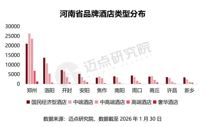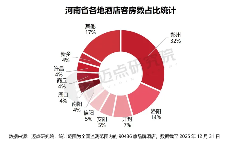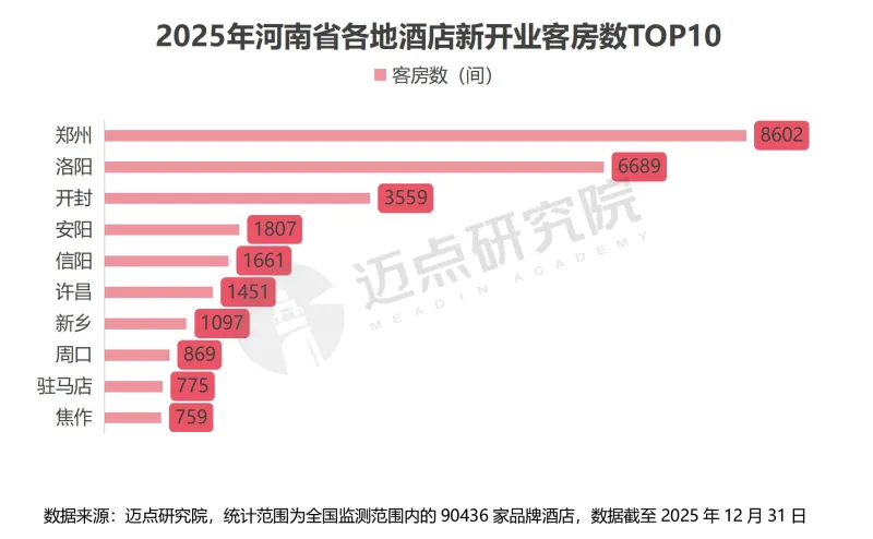 河南省酒店市场区域发展不平衡。省会城市郑州一极独大,凭借商务、交通、文旅等多重优势,占据全省酒店32%的客房份额。2025年新开业客房数达8602间,稳居全省首位。而洛阳依托龙门石窟等文旅资源与城市经济发展,2025年新开业客房数6689间,位列全省第二,与郑州共同构成全省酒店市场的增长极。