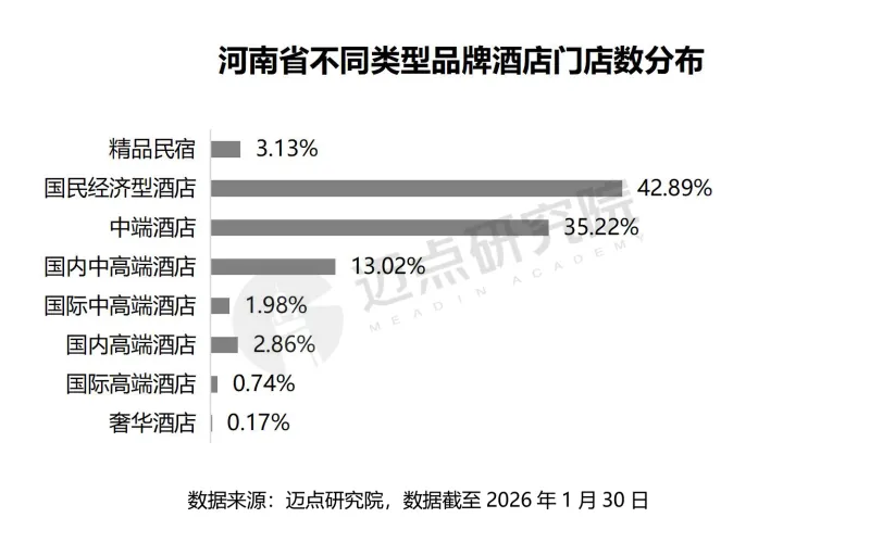 从品牌类型分布来看,国民经济型酒店与中端酒店占主导,国民经济型酒店(42.89%)与中端酒店(35.22%)占据全省品牌酒店的近八成份额。本土品牌牢牢占据中高端市场,国内中高端酒店占比13.02%,远超国际中高端酒店(2.86%),本土品牌凭借对本地消费习惯的精准把握,在大众与中高端市场形成强大竞争力。国际品牌聚焦核心城市高端领域,全省国际高端酒店(0.74%)与奢华酒店(0.17%)数量极少,且主要集中在郑州,开封等新晋文旅城市高端酒店供给仍处于起步阶段,高端住宿产品缺口显著。