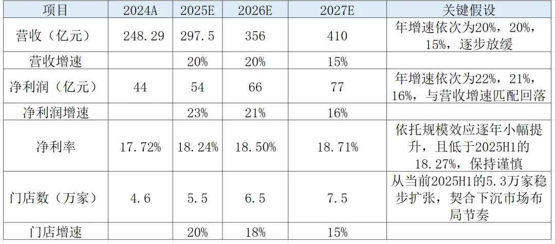 本次业绩预测采用递减增速模式,综合考虑基数效应、市场饱和压力及行业竞争加剧等因素,整体假设偏保守,具体核心指标预测如下: